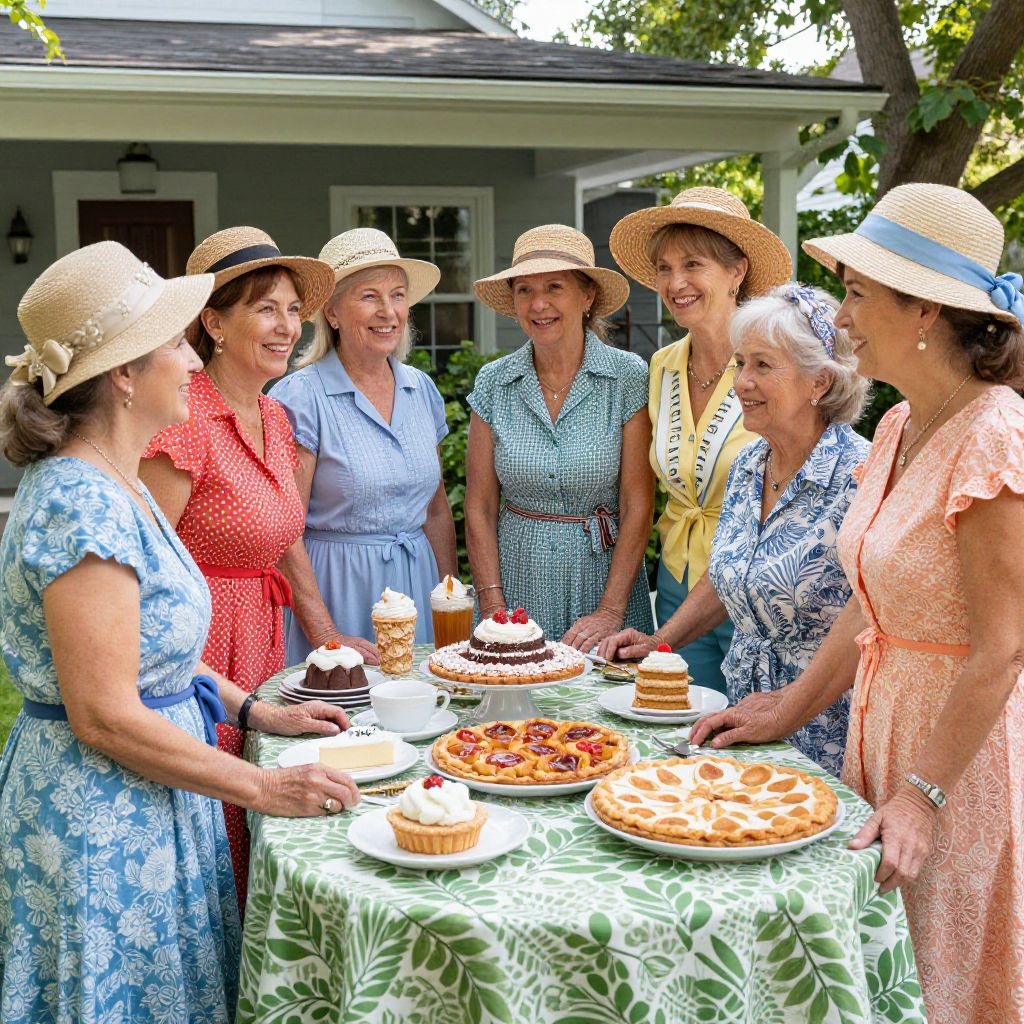 A joyful group of mature women dressed in colorful vintage-style clothing and straw hats, gathered outdoors around a table filled with an assortment of homemade pies and desserts. The setting is bright and garden-like with a green leafy tablecloth and a suburban home in the background.