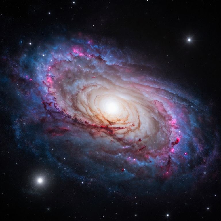 Photograph of a vibrant spiral galaxy in space. The galaxy has a bright, glowing white core surrounded by swirling, colorful gas clouds in shades of blue, pink, and purple. The outer edges of the galaxy are darker, with intricate, wispy structures. Two bright stars are visible in the dark, star-speckled background, adding contrast to the galaxy's luminosity. The image showcases the galaxy's stunning, intricate spiral arms and vibrant colors, highlighting its beauty and complexity in the vastness of space.