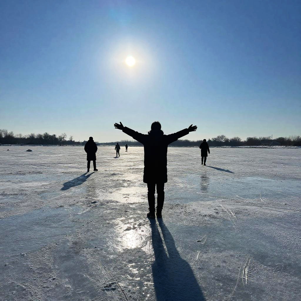 Photograph of a sunny, icy landscape with the sun glaring brightly in the clear blue sky. A lone person, silhouetted in dark winter clothing, stands in the center, arms outstretched, casting a long shadow on the snow-covered ground. Other shadowy figures are scattered across the frozen expanse in the background. The bright sunlight creates sharp contrasts and a sense of cold, crisp air.