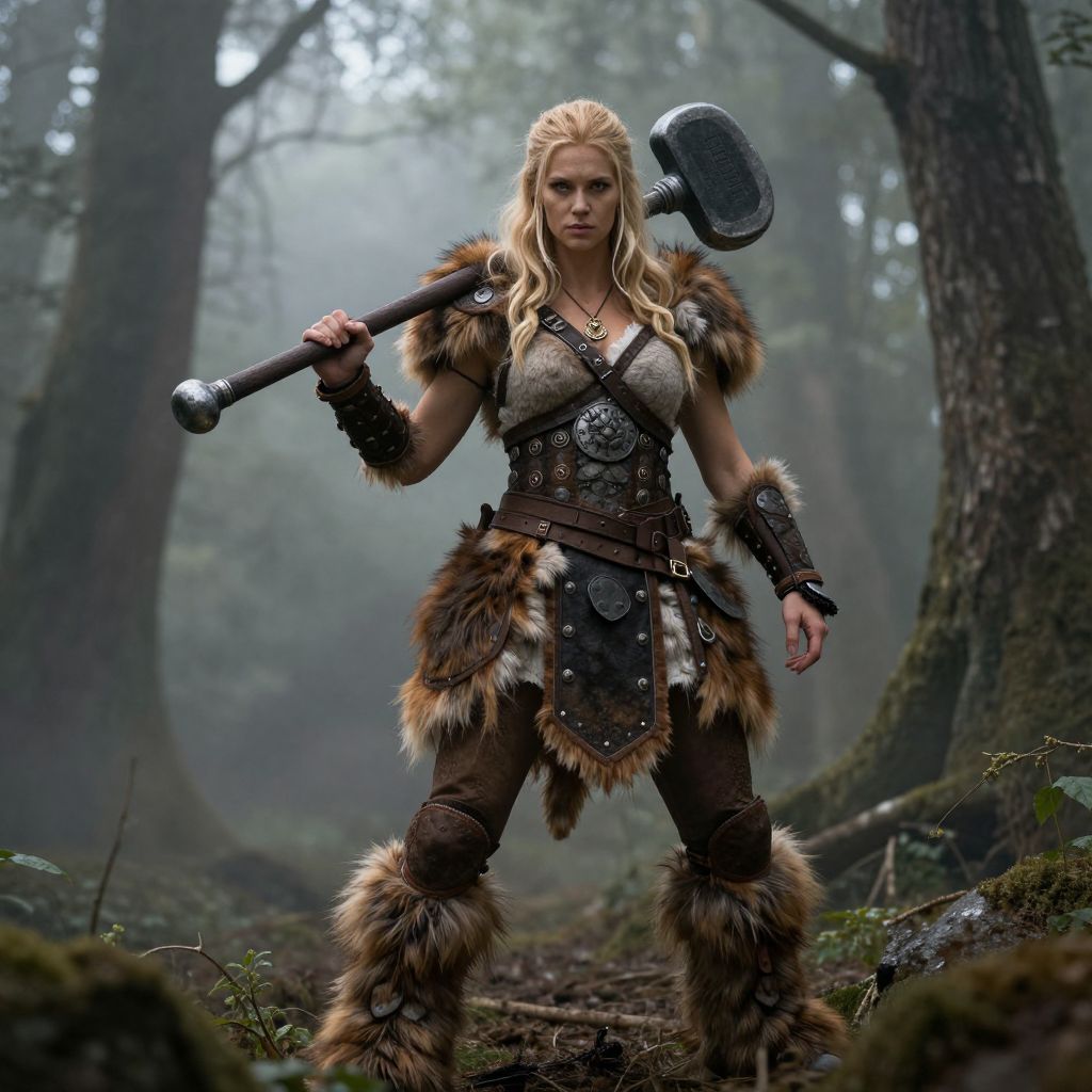 Photorealistic digital artwork of a fierce blonde warrior woman in fur and leather armor, wielding a large battle hammer in a misty forest.