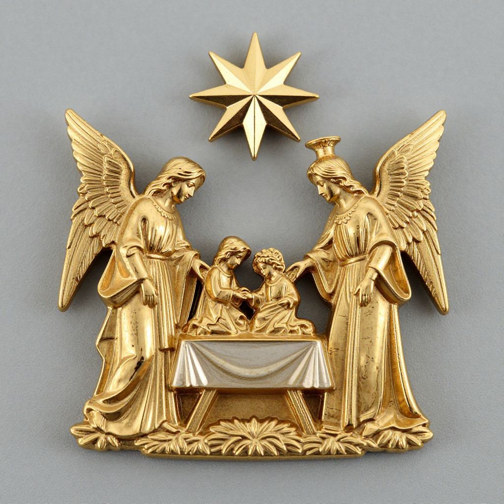 A gold-plated enamel Nativity ornament featuring two angelic figures flanking a manger with the Christ Child, crafted with intricate detailing and a radiant star atop, showcasing a classic religious iconography in a polished, high-quality finish.