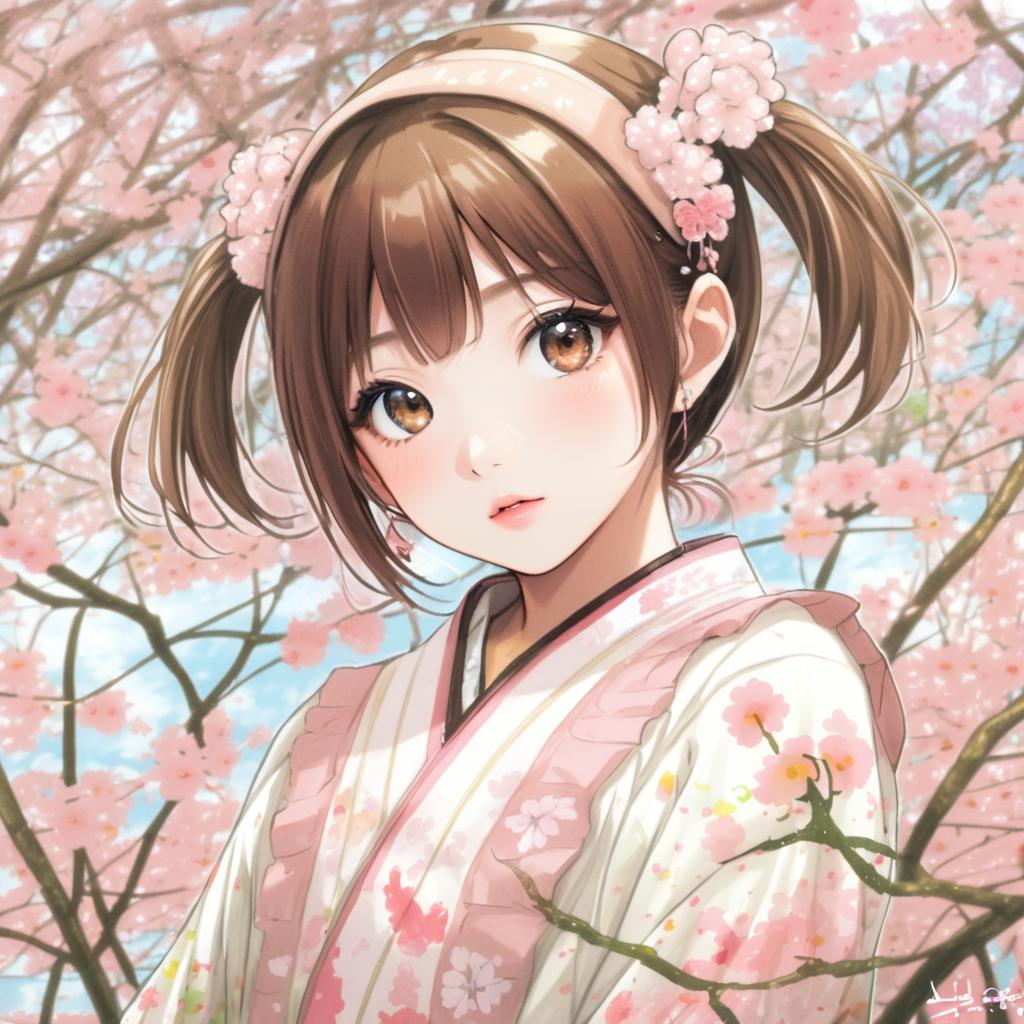 This digital anime-style illustration depicts a young Japanese woman with fair skin and large, brown eyes. She has brown hair styled in twin pigtails, each adorned with pink cherry blossom hairpins. She wears a white, traditional Japanese kimono with subtle pink patterns, partially obscured by cherry blossoms. The background is a soft, blurred mix of blue sky and cherry blossom branches, creating a dreamy, springtime atmosphere. Her expression is gentle and slightly melancholic, with a subtle blush on her cheeks. The artist's signature "Sakuragi" is visible in the bottom right corner.