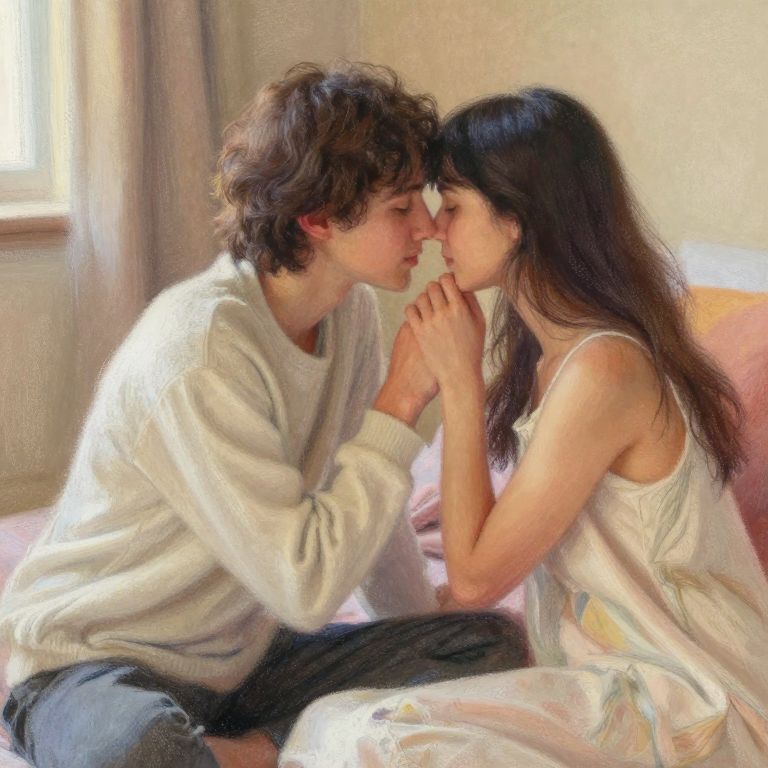 Tribbing, a delicate and intimate moment between two figures rendered in soft pastel colors, emphasizing connection and warmth, set in a cozy, ambient room with gentle lighting and flowing fabrics, capturing the essence of closeness and tenderness.