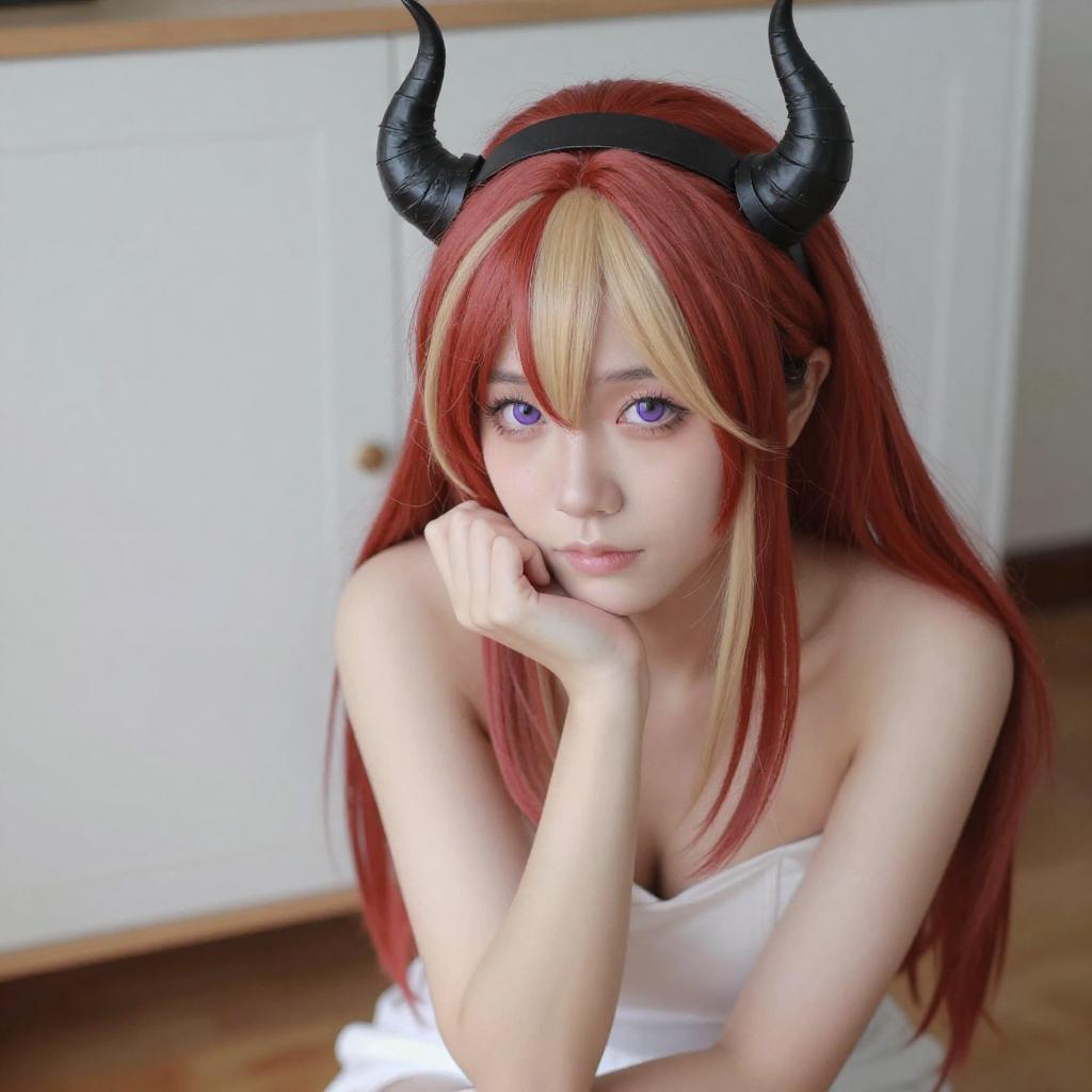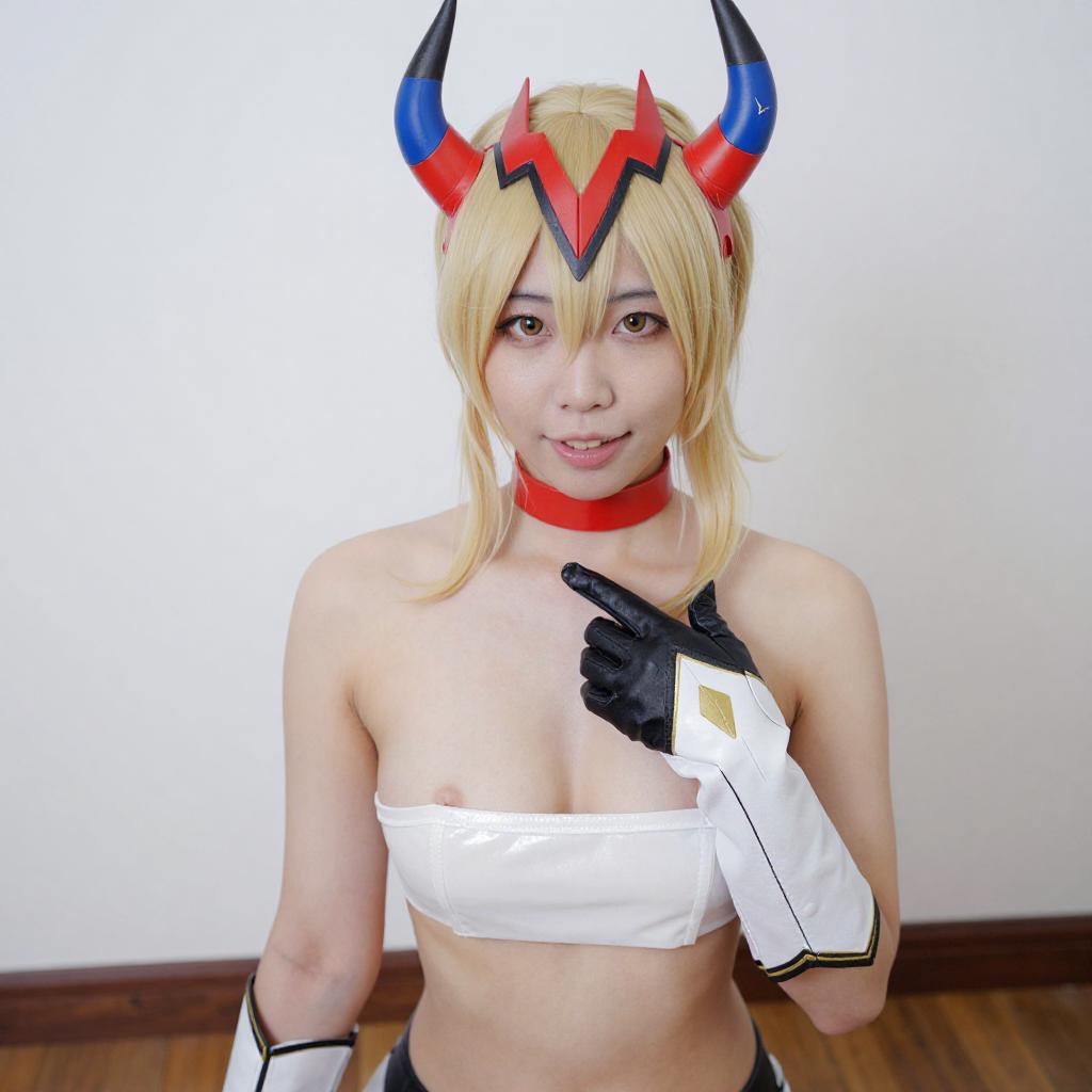 Photograph of an Asian woman with pale skin and blonde hair in a cosplay outfit. She wears a red and blue headpiece with horns, a red choker, and white and black gloves. Her top is a white bandeau, partially covering her small breasts. She smiles slightly, looking at the camera, with her right hand touching her chest. She is seated on a wooden floor against a white wall.