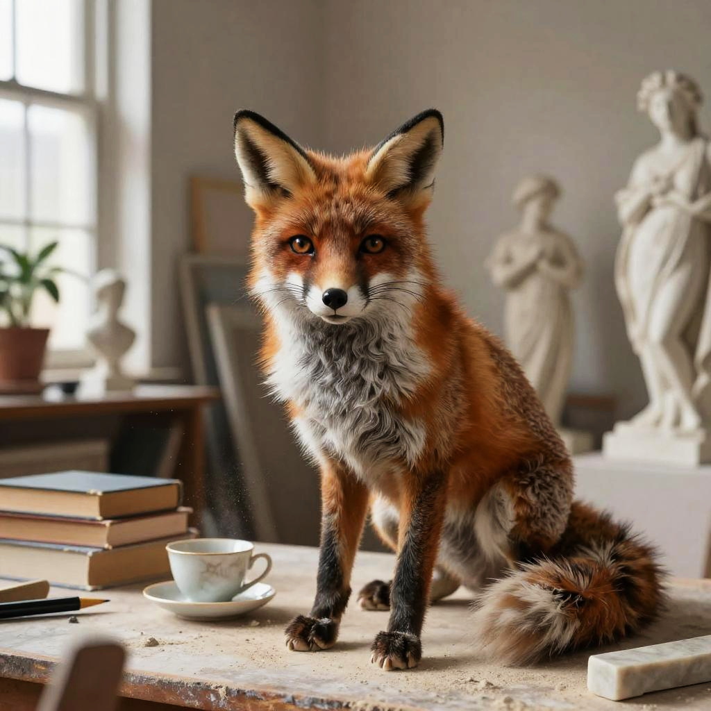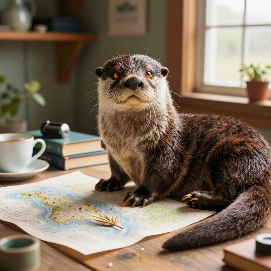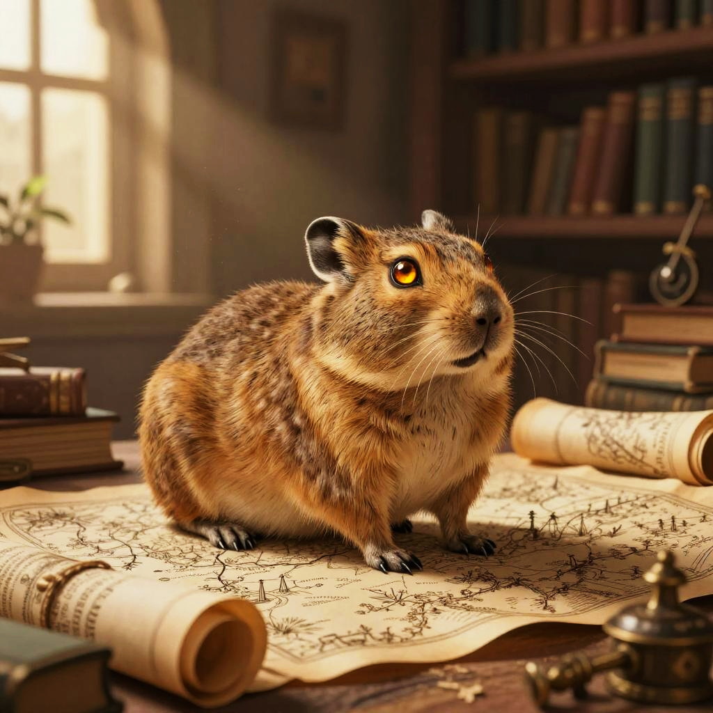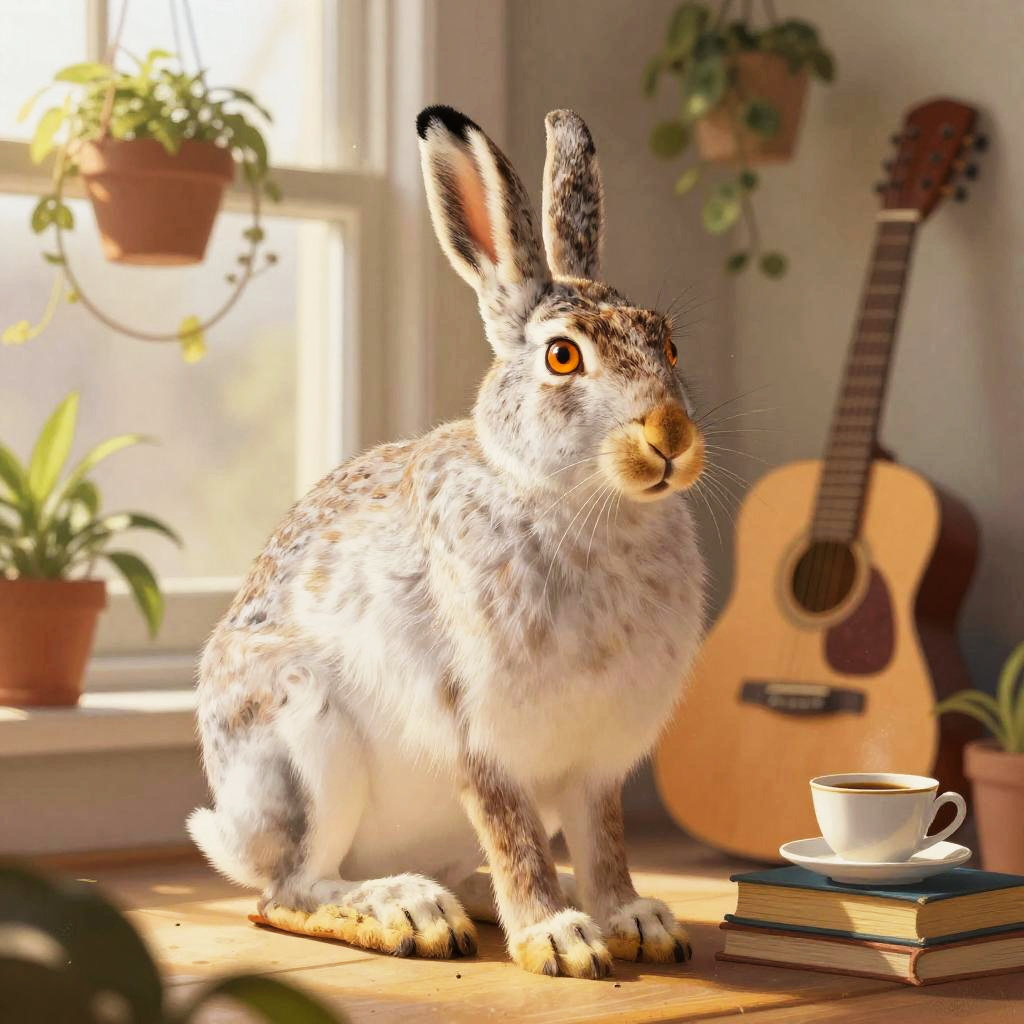Adult beaver furniture craftsman in bright workshop filled with wooden planks and handcrafted chairs, intricate fur and whisker detail, expressive hazel eyes catching warm highlights, relaxed natural pose, cozy props (books, teacup, instruments, plants), soft dust motes in the air, gentle window shadows, warm golden palette, subtle rim light, soft ambient lighting, inviting lived-in atmosphere, high fidelity texture, balanced composition, detailed colored pencil with realistic shading