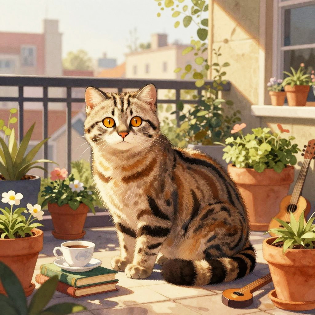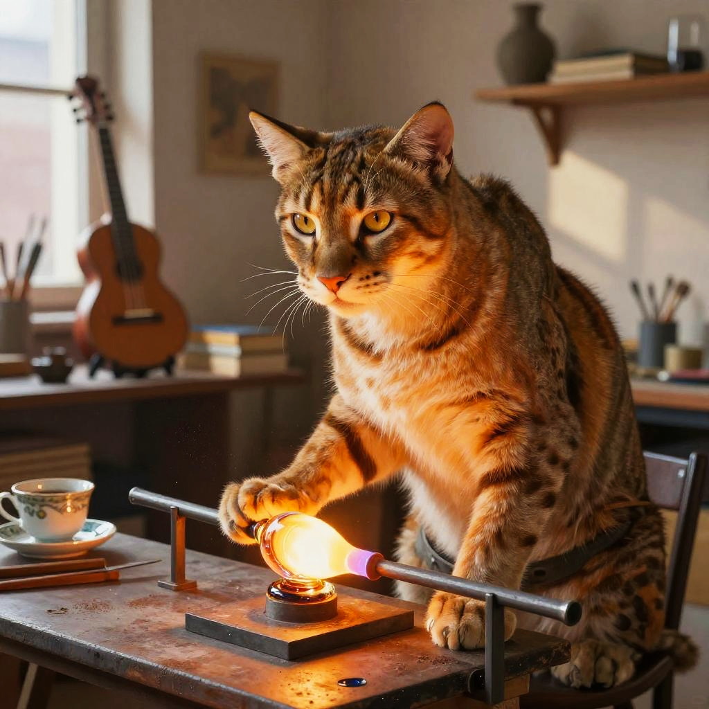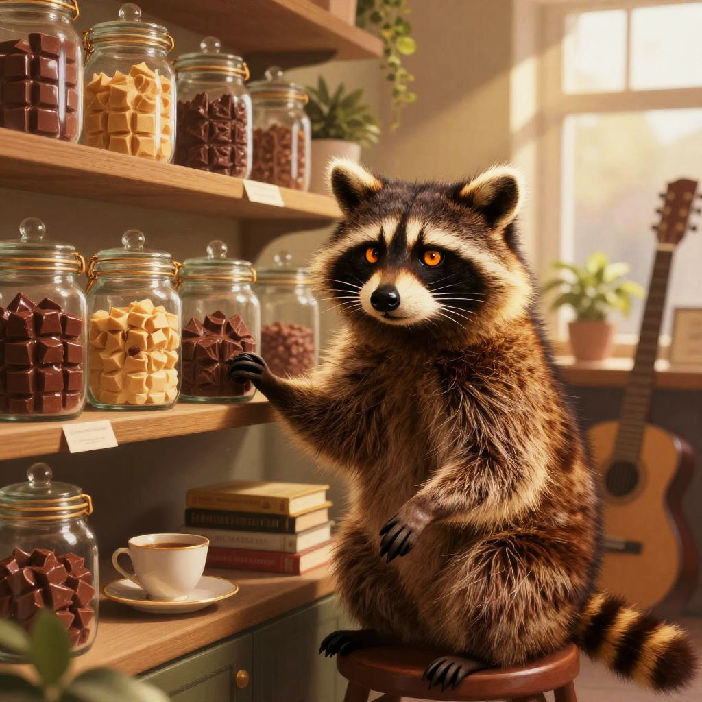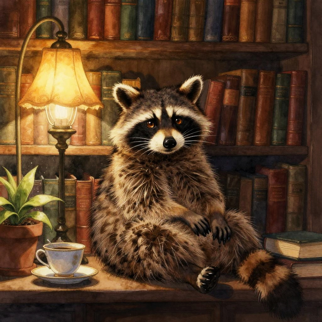 Adult beaver furniture craftsman in bright workshop filled with wooden planks and handcrafted chairs, intricate fur and whisker detail, expressive hazel eyes catching warm highlights, relaxed natural pose, cozy props (books, teacup, instruments, plants), soft dust motes in the air, gentle window shadows, warm golden palette, subtle rim light, soft ambient lighting, inviting lived-in atmosphere, high fidelity texture, balanced composition, detailed colored pencil with realistic shading
