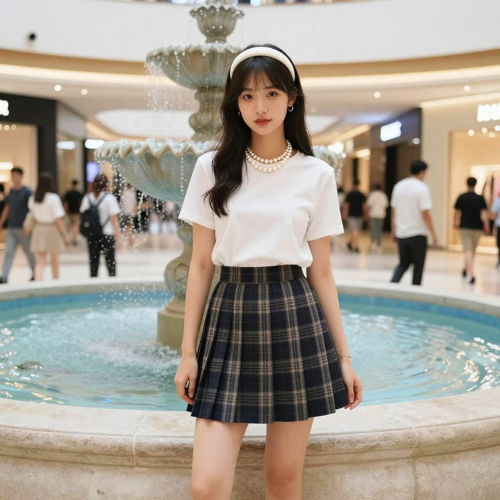 Mall preppy young adult posing by a fountain in a bustling mall, plaid skirt and headband, accessorized with pearl necklace, bright mall lighting, stylish and elegant