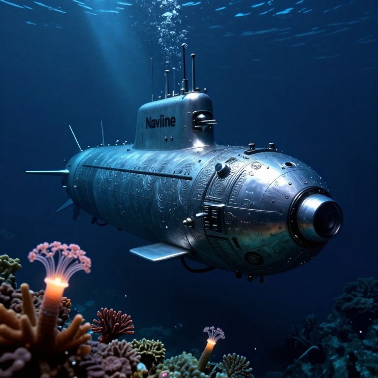 Naviline advanced submarine exploring a mysterious deep sea environment, bioluminescent creatures surrounding it, illuminated coral reefs, intricate mechanical textures on the vessel, dark underwater setting with beams of light piercing through, highly detailed and cinematic.