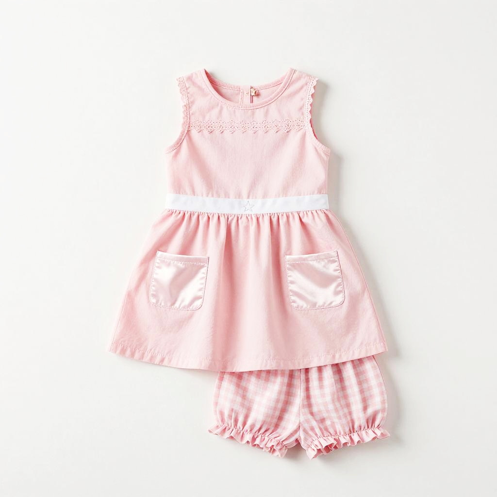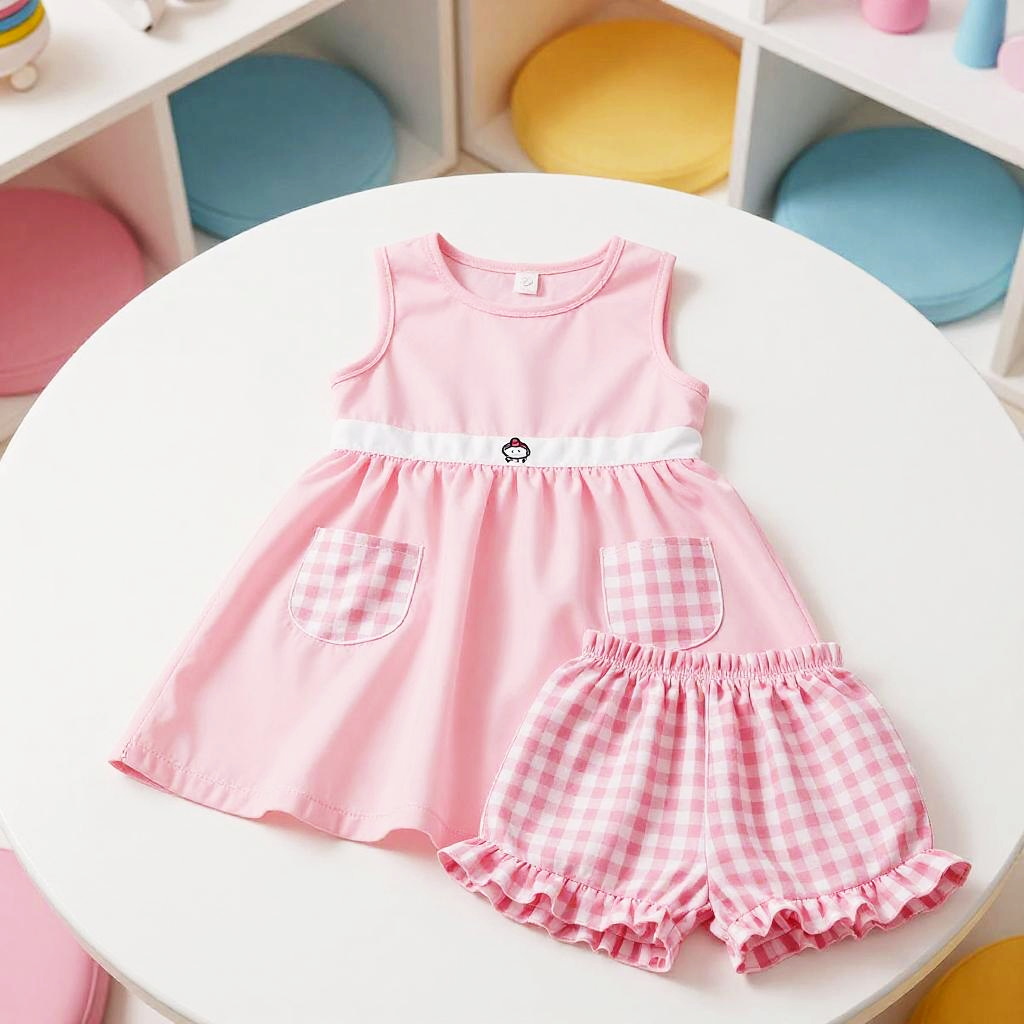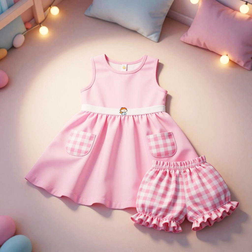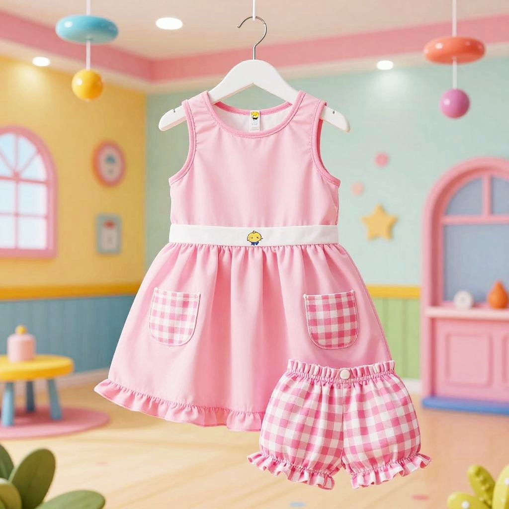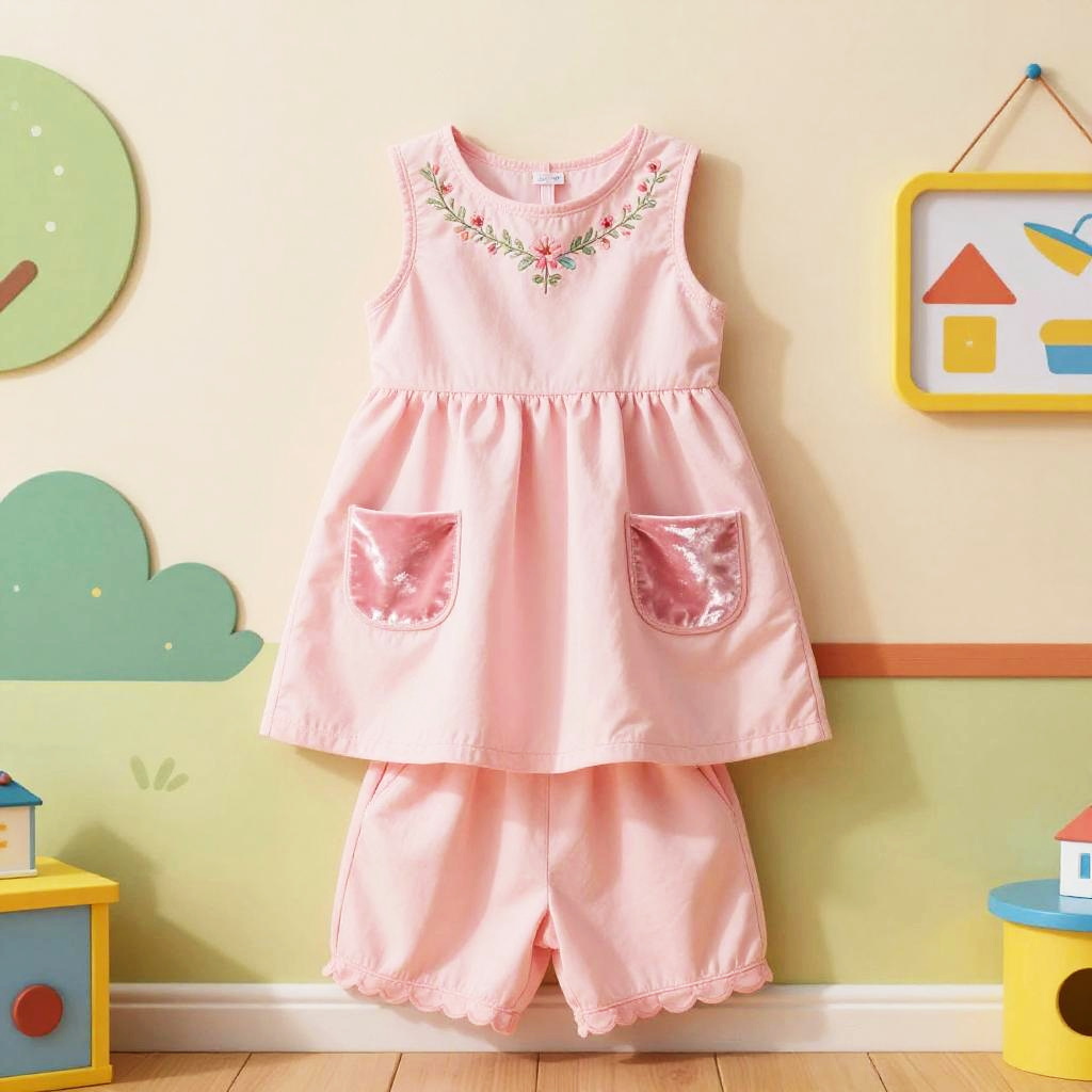 High resolution lifestyle photograph depiction in vibrant playroom with colorful wall murals and educational decor. Pink children's outfit laid out neatly: sleeveless pink dress with a subtle floral embroidery around the neckline, two pastel pink velvet pockets; paired with matching soft pink cotton shorts with scalloped hems. True color, wrinkle-free fabric, centered and tidy composition, kid-friendly aesthetics. soft daylight with bright but gentle shadows.