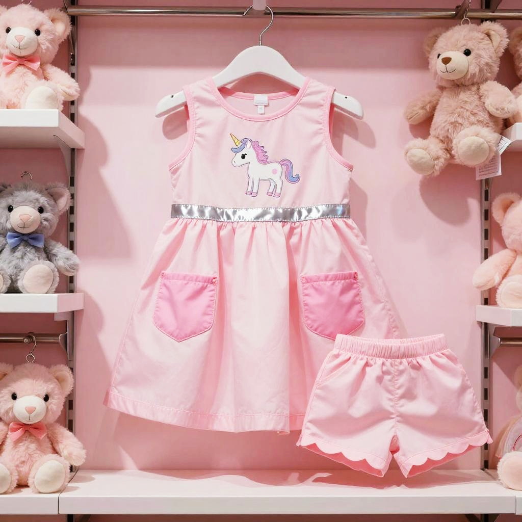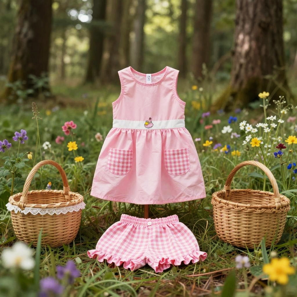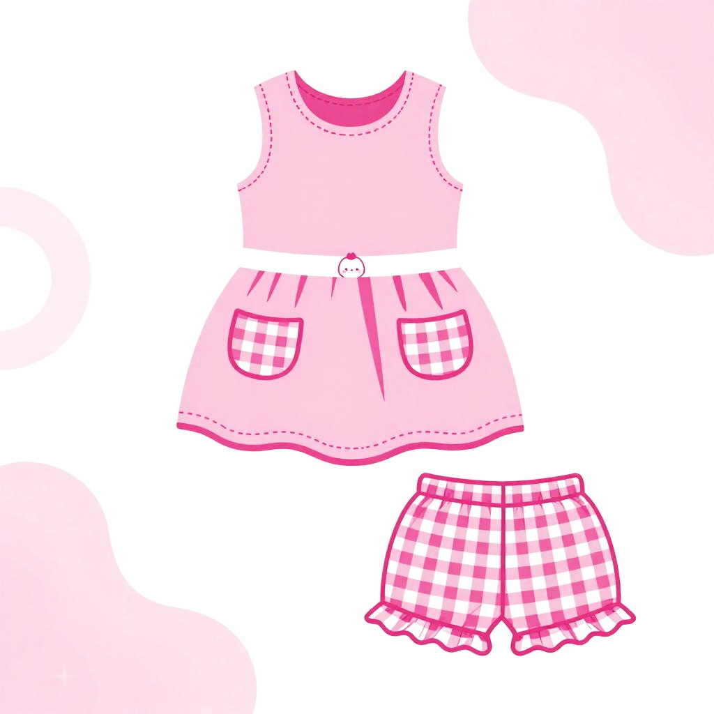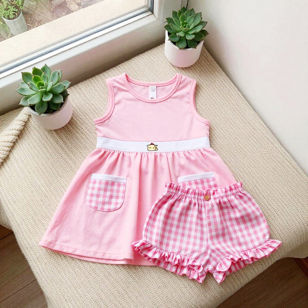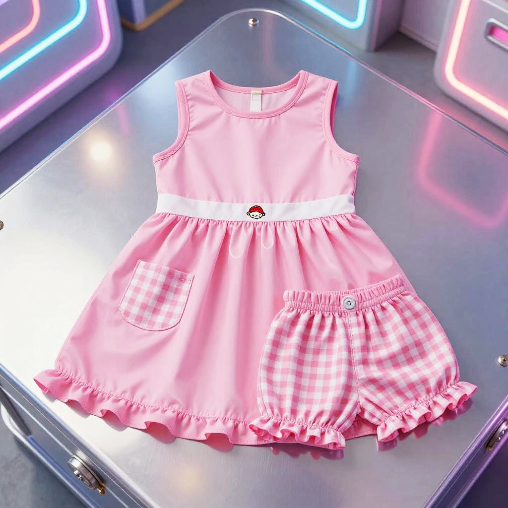 High resolution lifestyle photograph depiction in vibrant playroom with colorful wall murals and educational decor. Pink children's outfit laid out neatly: sleeveless pink dress with a subtle floral embroidery around the neckline, two pastel pink velvet pockets; paired with matching soft pink cotton shorts with scalloped hems. True color, wrinkle-free fabric, centered and tidy composition, kid-friendly aesthetics. soft daylight with bright but gentle shadows.