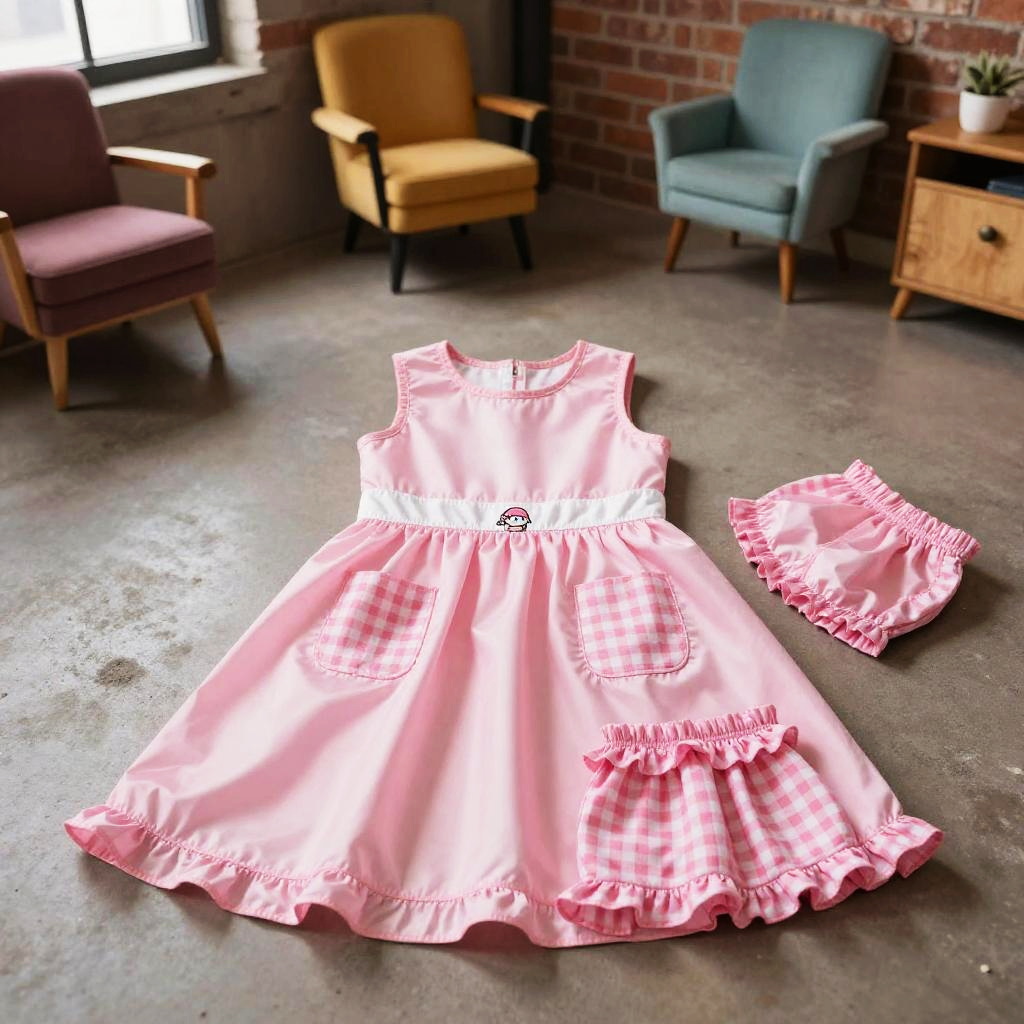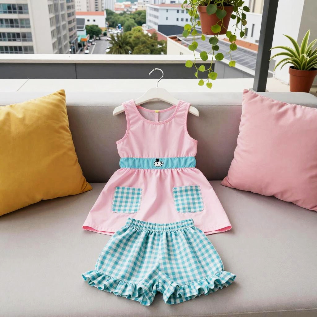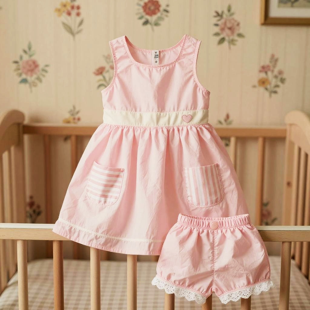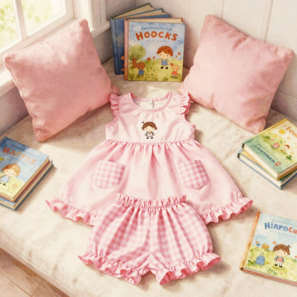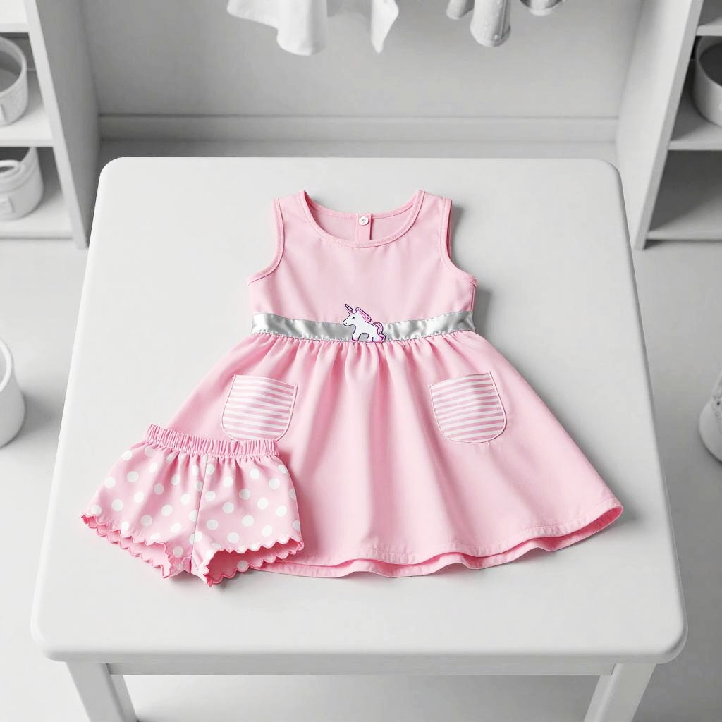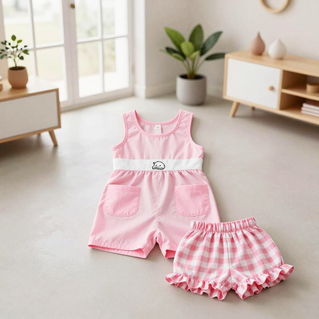 High resolution lifestyle photograph depiction in vibrant playroom with colorful wall murals and educational decor. Pink children's outfit laid out neatly: sleeveless pink dress with a subtle floral embroidery around the neckline, two pastel pink velvet pockets; paired with matching soft pink cotton shorts with scalloped hems. True color, wrinkle-free fabric, centered and tidy composition, kid-friendly aesthetics. soft daylight with bright but gentle shadows.
