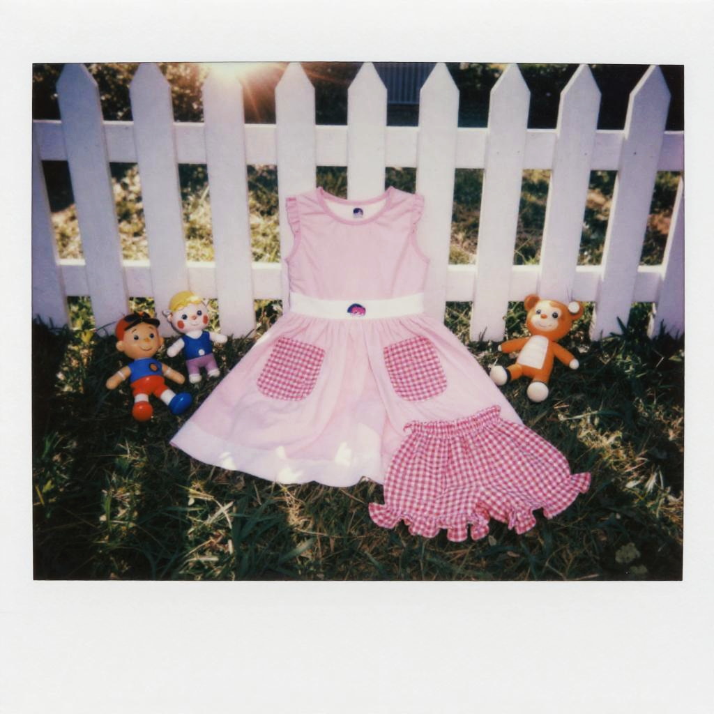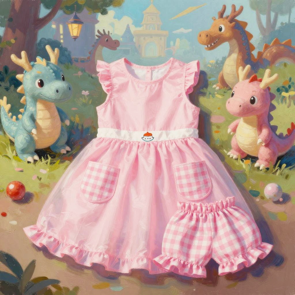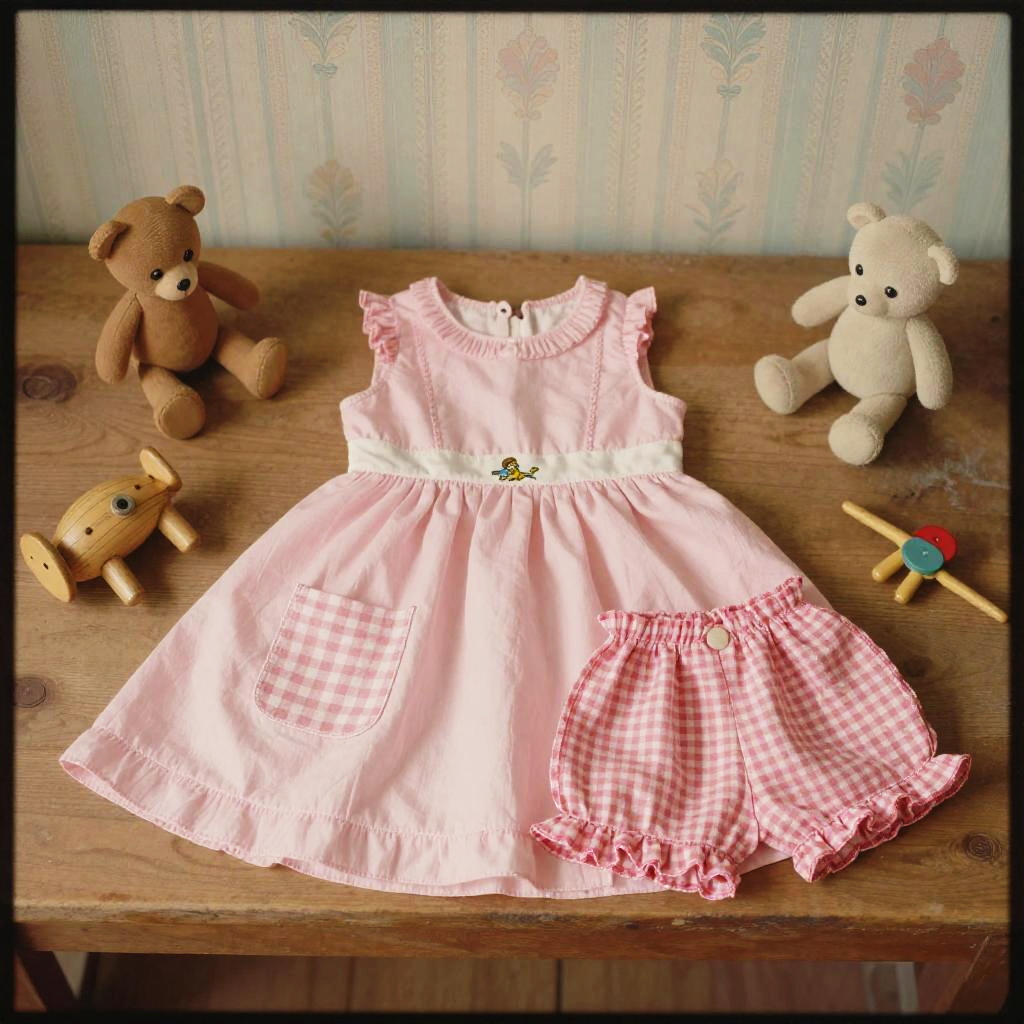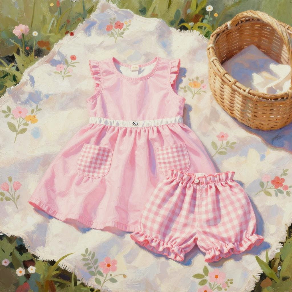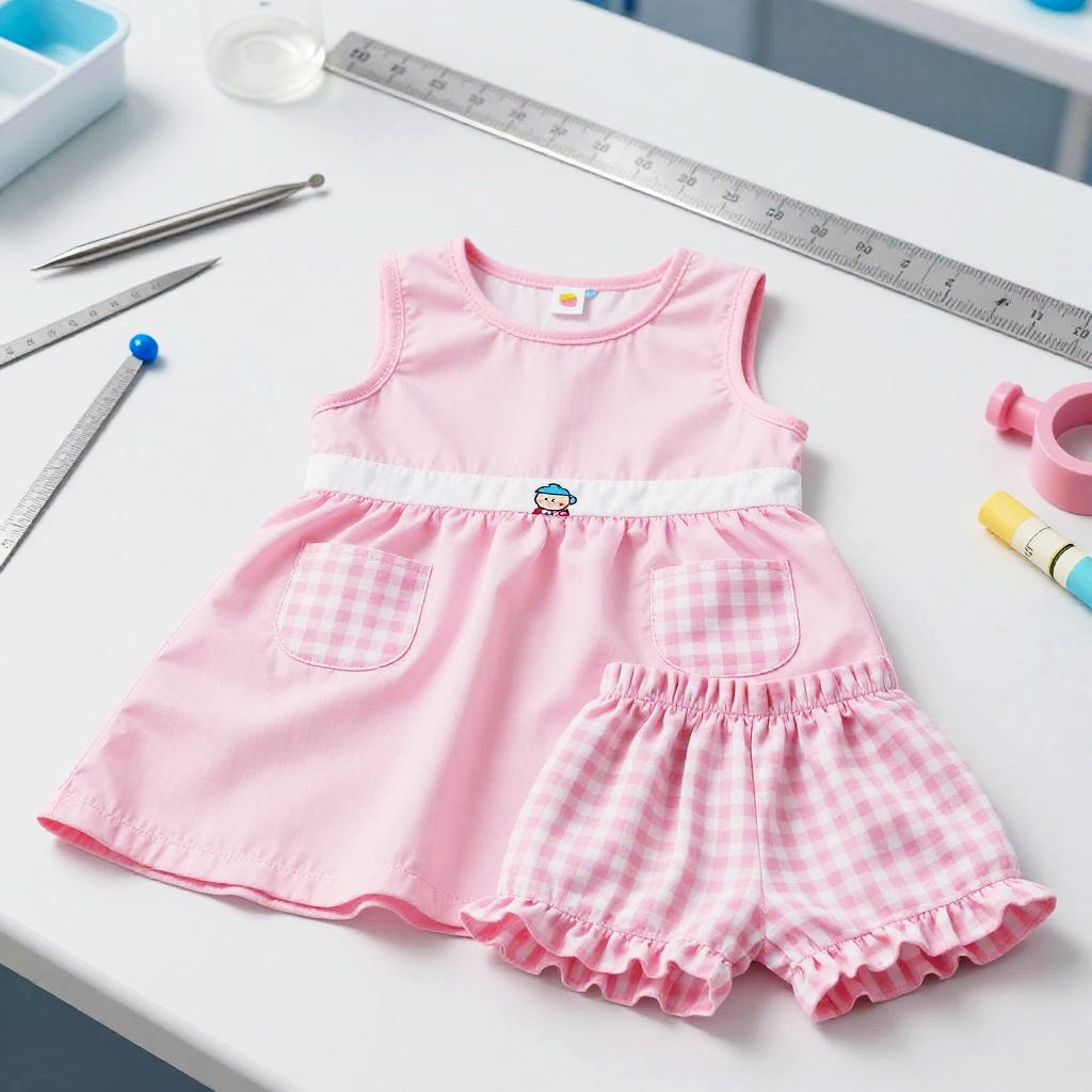 High resolution lifestyle photograph depiction in vibrant playroom with colorful wall murals and educational decor. Pink children's outfit laid out neatly: sleeveless pink dress with a subtle floral embroidery around the neckline, two pastel pink velvet pockets; paired with matching soft pink cotton shorts with scalloped hems. True color, wrinkle-free fabric, centered and tidy composition, kid-friendly aesthetics. soft daylight with bright but gentle shadows.