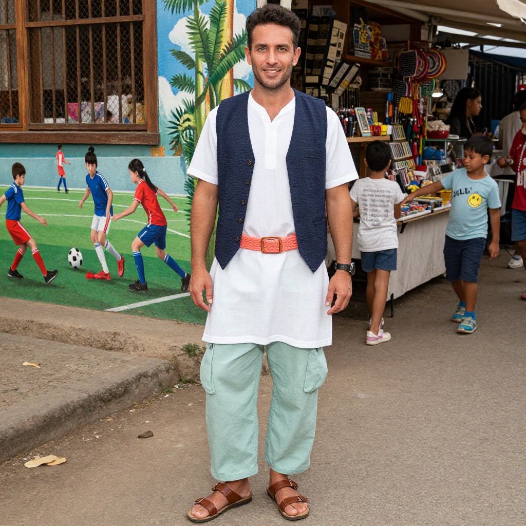 A man, flowy white tunic, seafoam green cargo pants, brown leather sandals, textured navy vest, coral-colored woven belt, vibrant street murals, bustling market stalls, children playing soccer, cameraphone style, relaxed smile, warm and inviting expression. Man has masculine face and piercing eyes