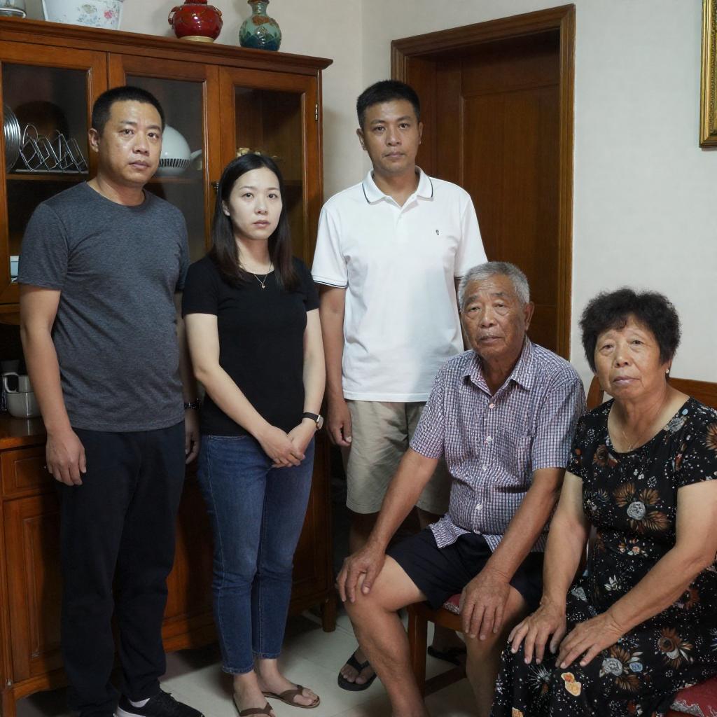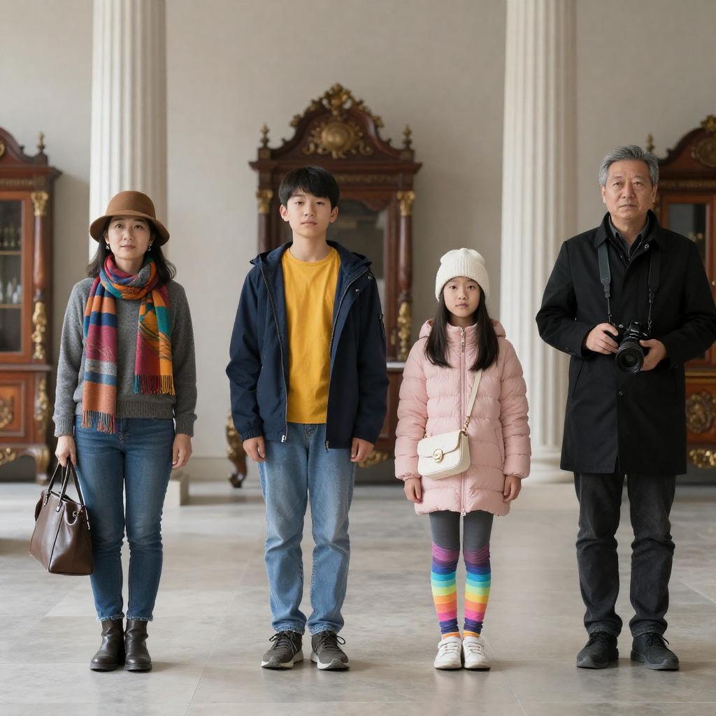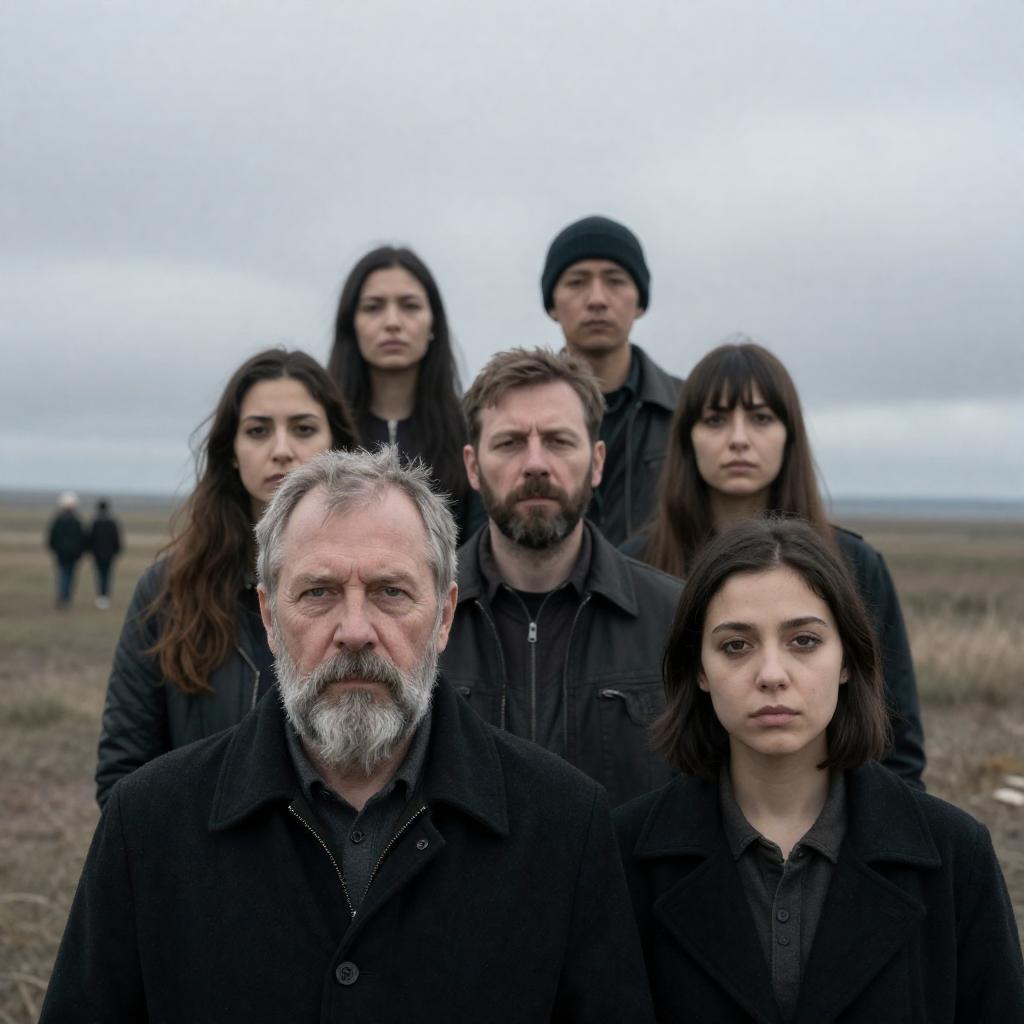 Photograph of a group of people standing in a doorway at night. A bald man with raised arms stands in the doorway, illuminated by golden light. Six people in winter clothing, including a woman in a gray shawl and a child in a checkered coat, surround him. Snow-covered door frame and window arch. Warm light contrasts with dark exterior. Intense expressions on faces.