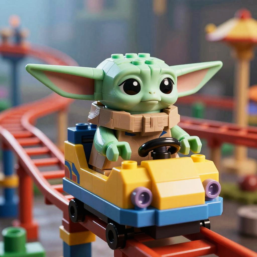 1Baby Yoda riding plastic Lego style riding colourful roller coaster together, cute, cinematic, colorful background, concept art, 8k, dramatic lighting, high detail, highly detailed, hyper realistic, intricate, intricate sharp details, octane render, smooth, studio lighting, trending on artstation., cinematic photorealistic, 8k uhd natural lighting, raw, rich, intricate details, key visual, atmospheric lighting, 35mm photograph, film, bokeh, professional, 4k