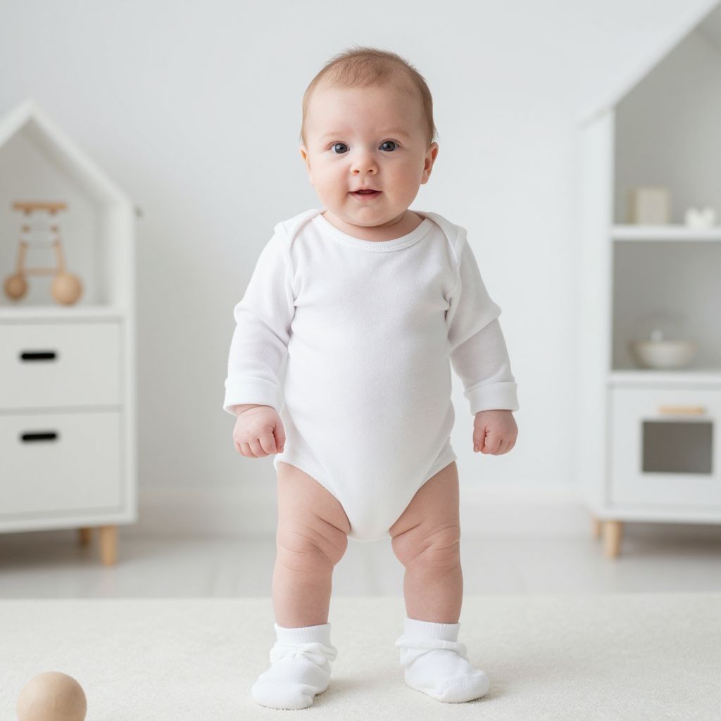 Photograph of a cute, light-skinned baby with short blonde hair, wearing a white onesie and socks, standing in a bright, modern nursery