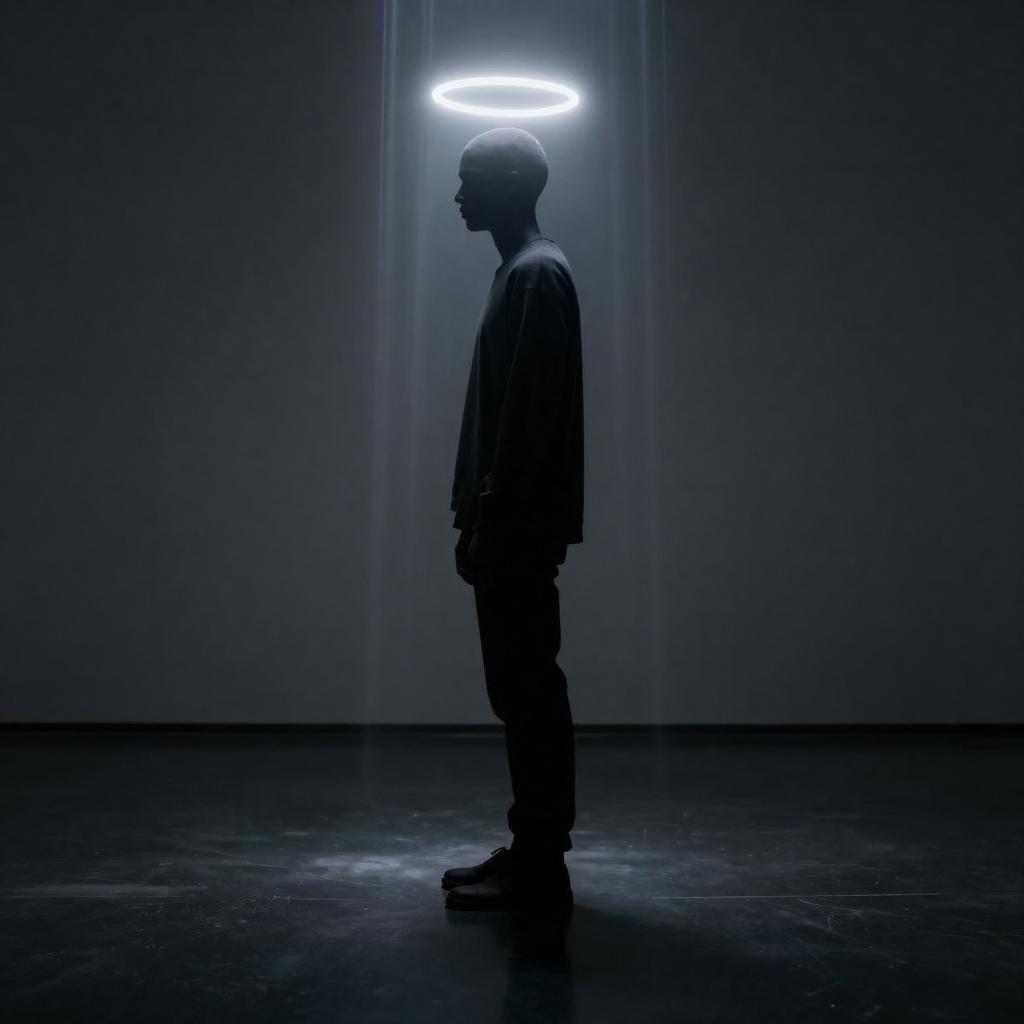 Photograph of a surreal art installation featuring a shadowy, human-like figure with a glowing white halo and head, standing in profile against a dark, minimalist background. The figure is illuminated by vertical white light beams, creating a ghostly, ethereal effect. The floor is dark and reflective, enhancing the mysterious atmosphere. The overall composition is dramatic and thought-provoking.