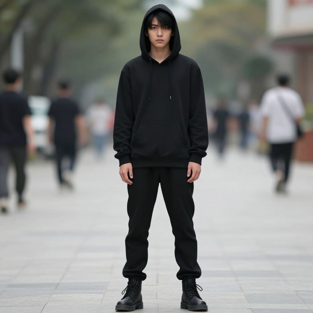 A person in an orange outfit with a hood and a pair of orange shoes is standing confidently with their hands on their hips, exuding a serious and determined expression. The individual has a strong, athletic build, sharp facial features, and dark hair slightly tousled, adding to their intense and focused demeanor. The scene is set in a neutral, urban backdrop with soft daylight filtering through the environment, highlighting the vivid orange tones of the outfit against a balanced, realistic background.