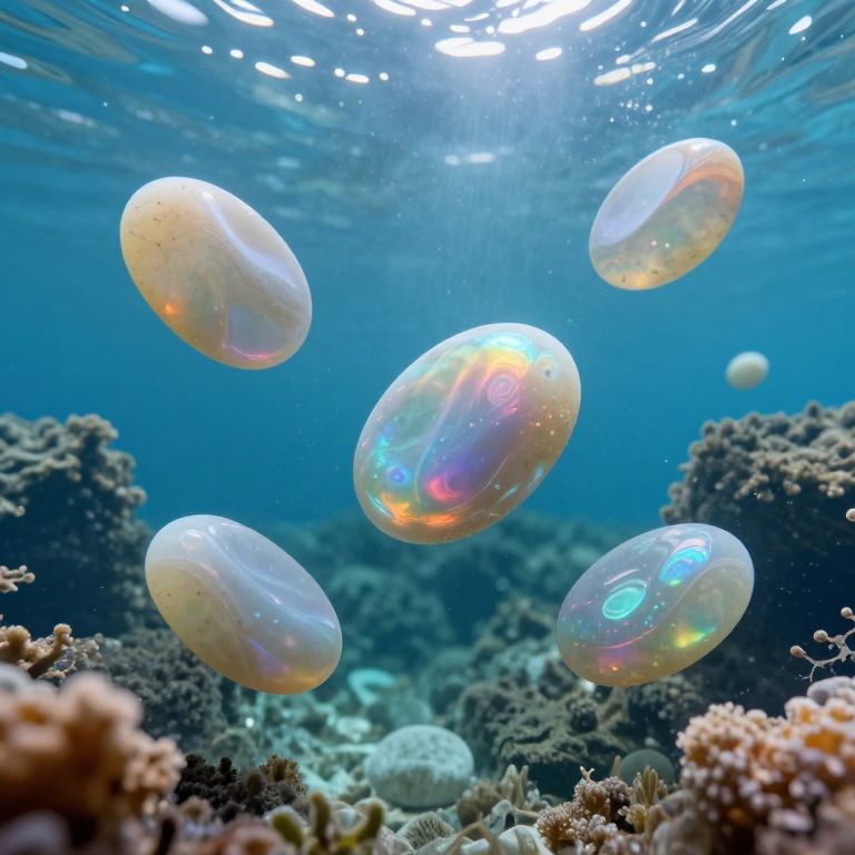 A serene underwater realm where smooth, iridescent ovoid stones drift effortlessly, defying gravity and currents, as they transform into vibrant hues and float serenely among rocky outcrops.
