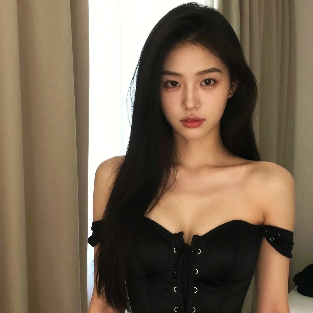 Photograph of an Asian woman with long, straight black hair and fair skin, standing in front of beige curtains with a bright white window behind her. She has a slender build, small breasts, and is wearing an off-the-shoulder, black corset-style top with button details down the front. Her facial expression is neutral, with slightly parted lips and dark, almond-shaped eyes. The lighting is soft, highlighting her delicate features. The background is simple, focusing attention on her. The overall style is modern and minimalistic.