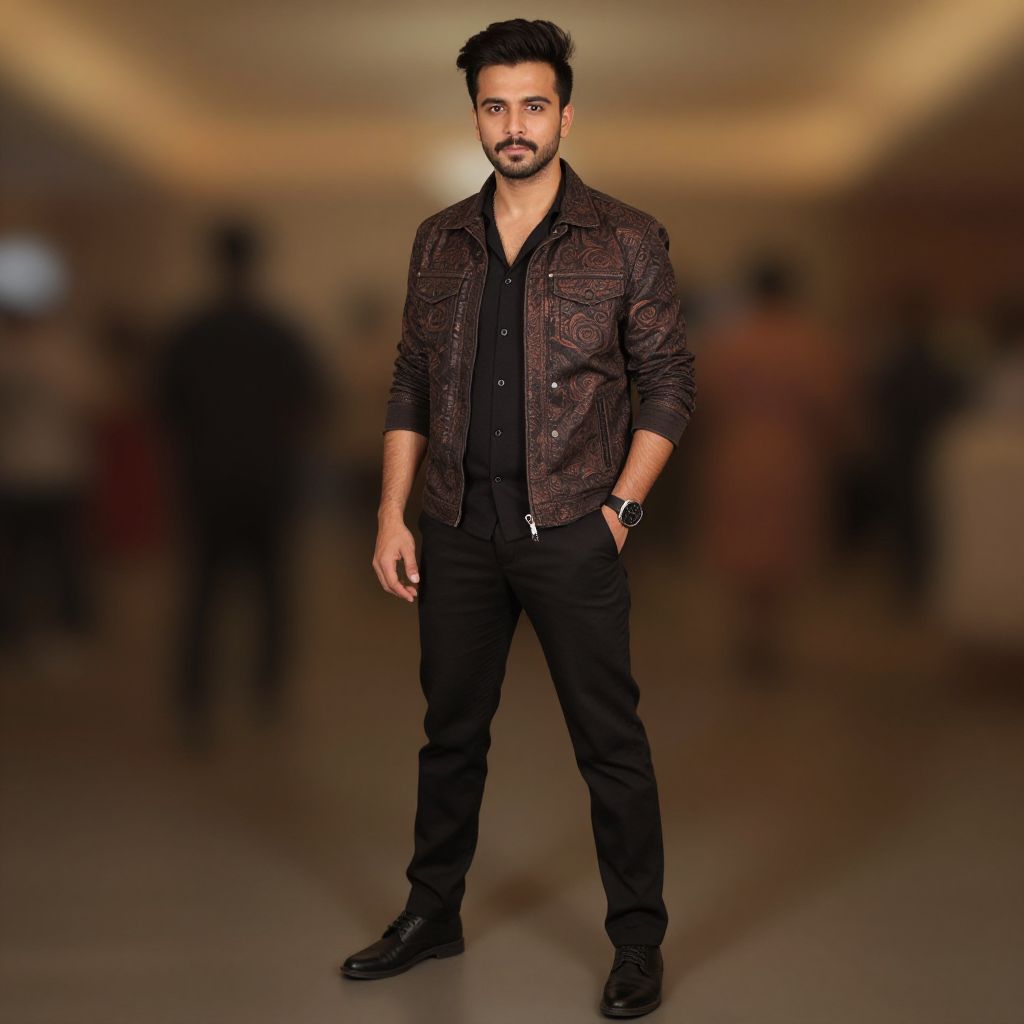 "bollywood theme party dress, 1boy, male focus, solo, facial hair, mustache, jacket, watch, black hair, pants, looking at viewer, full body, wristwatch, beard, blurry, standing, blurry background, black footwear, hand in pocket, indoors, long sleeves, shirt, black eyes Realistic photo of casual sexy person with pretty face"