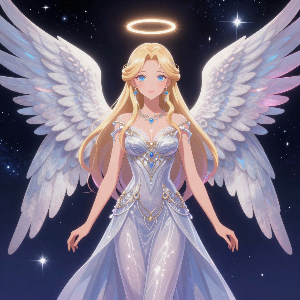 Digital anime-style illustration of a blonde angel with blue eyes, white wings, glowing halo, and blue earrings, wearing a detailed white gown, against a