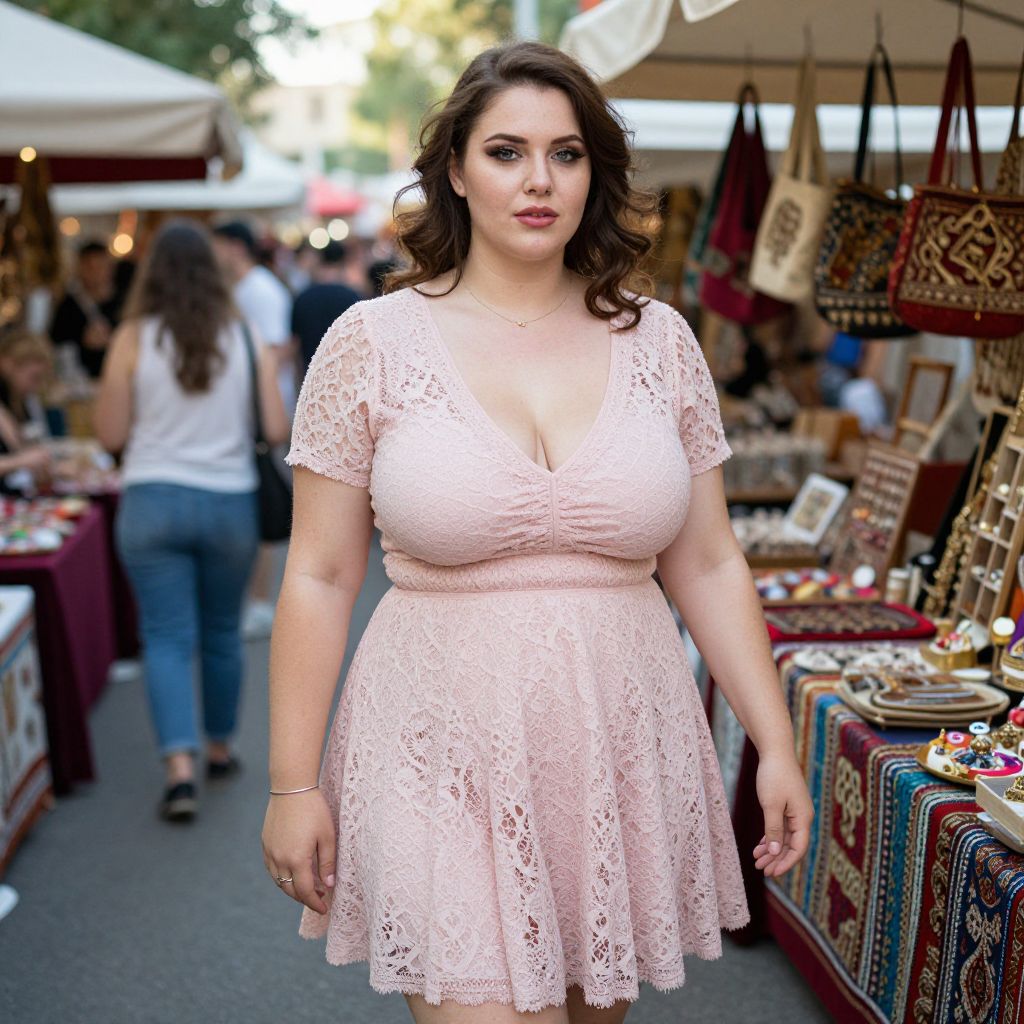 A Plus-size woman in a romantic, pastel pink lace dress with capped sleeves and a flared skirt stands at a bazaar during a cultural festival, enjoying the vibrant atmosphere. The visual style is reminiscent of a pinhole camera, capturing the soft, dreamy quality of the scene as she admires the colorful stalls around her, with simple accessories like a thin bracelet and minimalistic ring complementing her look. Sexy. Pretty face and beаutiful eyes. Big breasts