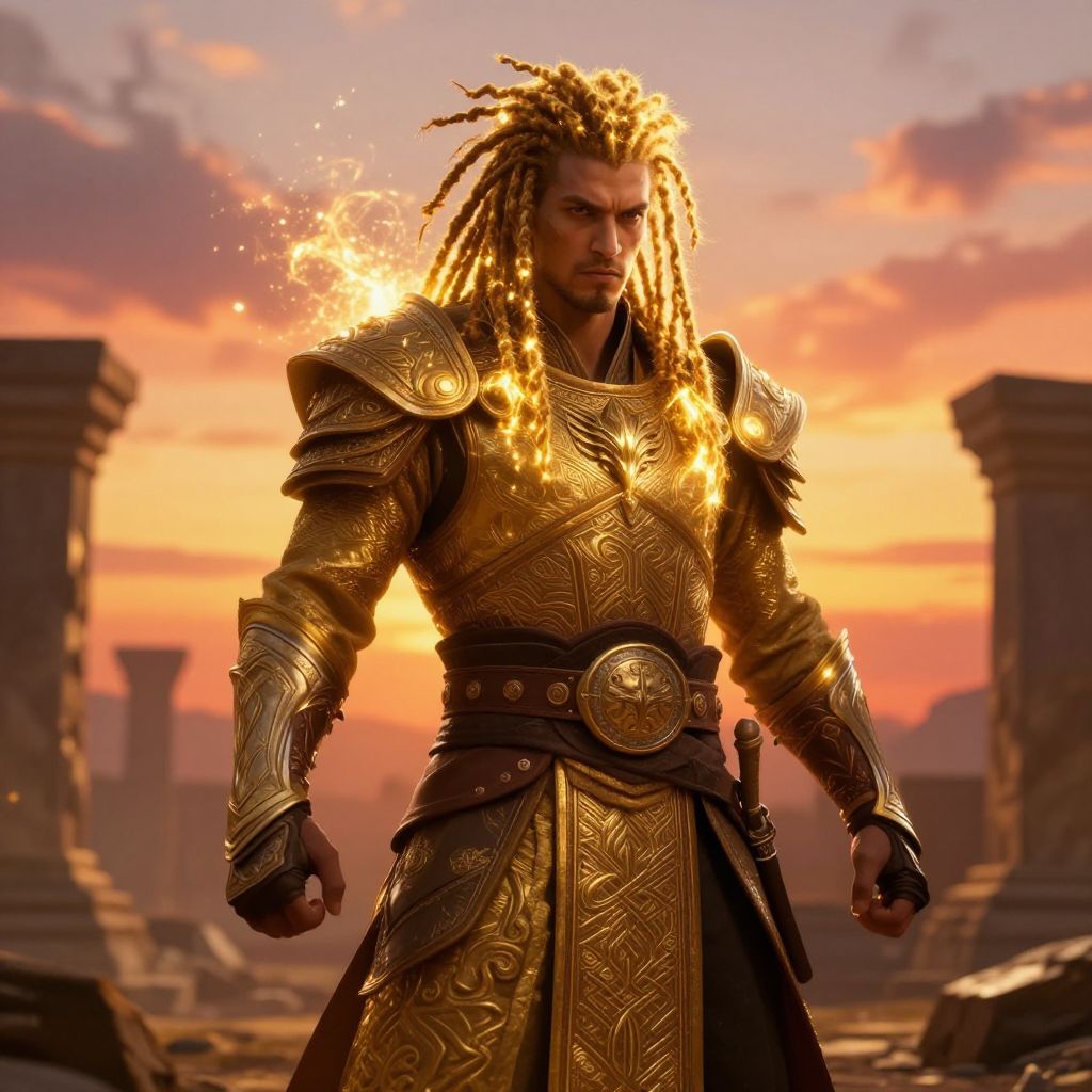 Gold dreads male in fantasy warrior attire, dreadlocks glowing with magical golden light, standing on ancient battlefield ruins, epic sunset sky, armor with intricate patterns, fierce determined look, highly detailed fantasy art style with vibrant colors.