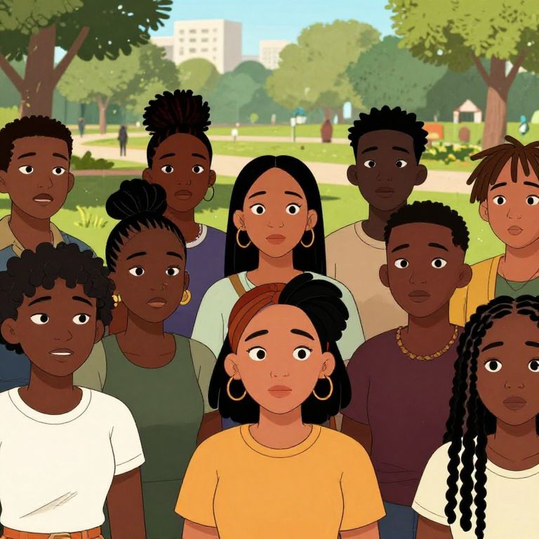 Digital illustration of diverse group of young Black and Brown people with various hairstyles, wearing casual clothes, standing in a sunny park.
