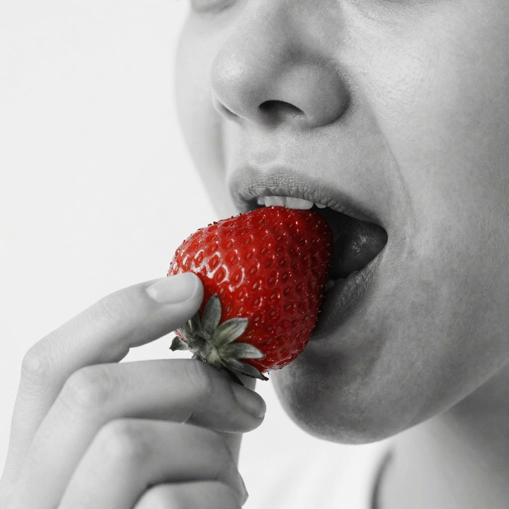 Close-up photograph of a person's face in black and white, except for a vibrant red strawberry being bitten into.
