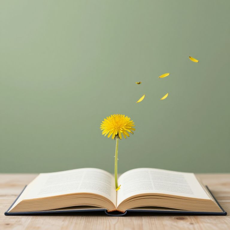 Photograph of an open book with a single, vibrant yellow dandelion stem emerging from its center. The dandelion's petals are blown away, floating in mid-air to the right. The book's pages are cream-colored, and it rests on a light wooden surface. The background is a solid, muted green, creating a calm and simple setting. The image has a fresh, natural aesthetic, with soft lighting highlighting the dandelion's bright yellow color and the book's textured pages.