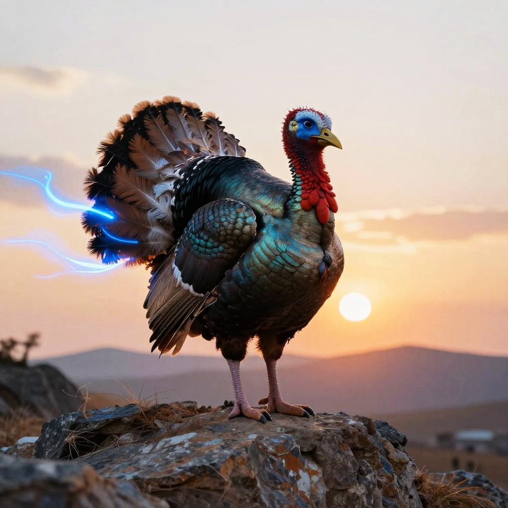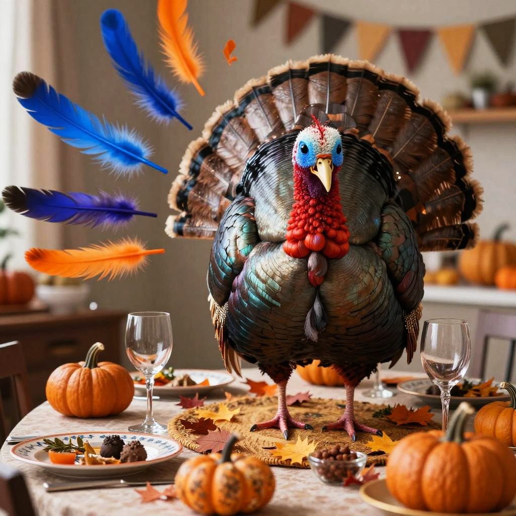 Turkey Sonic sprinting through a dense autumn forest, leaves swirling around with a blur of vibrant feathers, emitting sparks of sonic speed with dynamic motion effects.