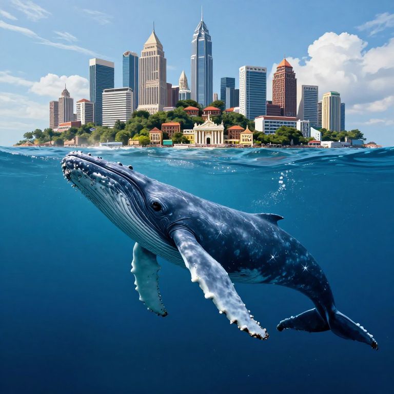 A colossal humpback whale glides serenely beneath the waves, its massive form dwarfing a sprawling cityscape perched improbably atop a lush island, where modern skyscrapers and historic architecture coexist in perfect harmony with the oceanic realm.