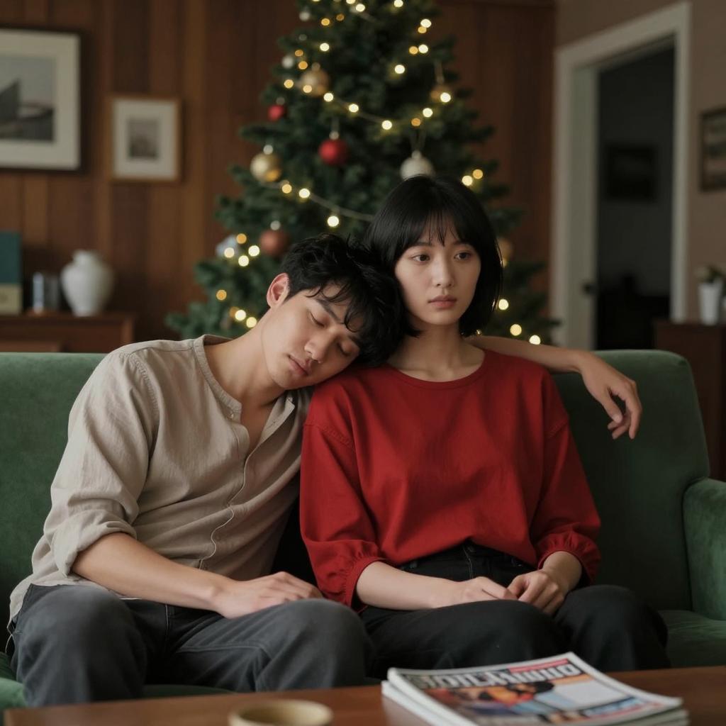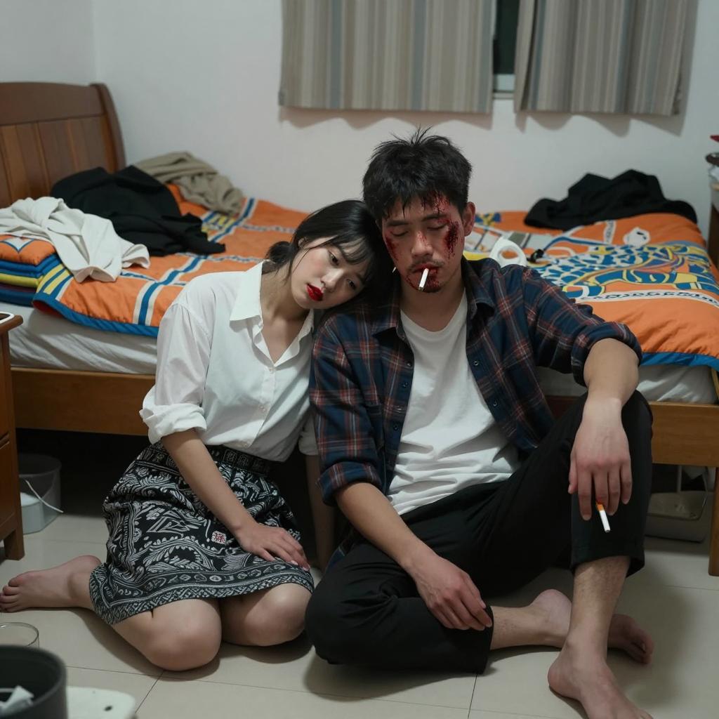 Photograph of two Asian individuals in a cluttered bedroom. Woman with red lipstick, white shirt, and black patterned skirt sits against a man with blood on his face, plaid shirt, and white t-shirt. Both sit on the floor, man with cigarette in mouth. Unmade bed with orange and blue patterned blanket in background. Man has short, dark hair. Woman has black hair tied back. Woman's head rests on man's shoulder. Bedside clutter includes clothes and objects. Room has striped curtains.
