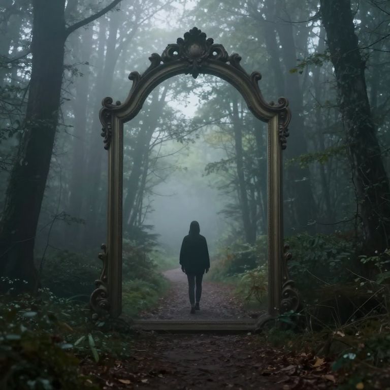 In the heart of a misty, spectral forest, a person walks toward an ornate, arch-shaped mirror that defies its frame, seamlessly merging with the ethereal path ahead, inviting the viewer into a realm where reality and reflection blur into an otherworldly mystery.