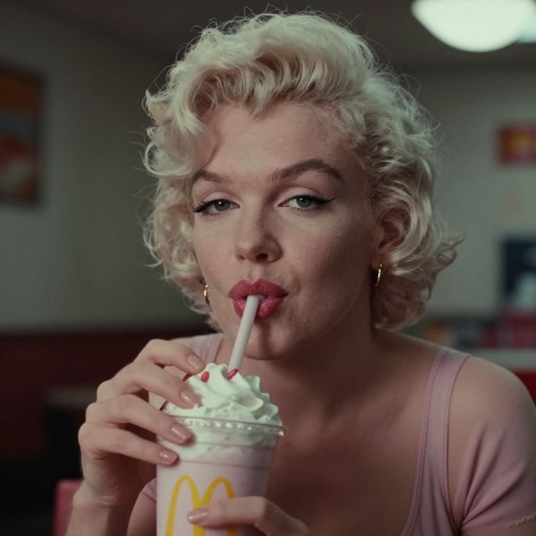 Film still of marilyn monroe drinking a milkshake in mcdonalds, focus on faces, cinematic lighting, unreal engine, steve mccurry, volumetric lighting.....