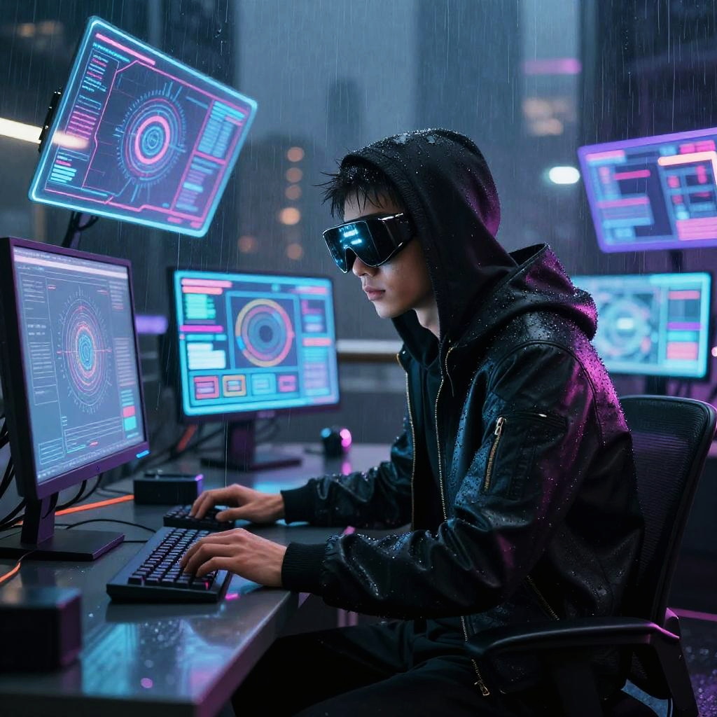 Jauan as a futuristic cyberpunk hacker sitting at a neon-lit workstation, multiple holographic screens floating around, wearing high-tech goggles, rain-soaked cityscape in the background, vibrant colors, sci-fi theme.