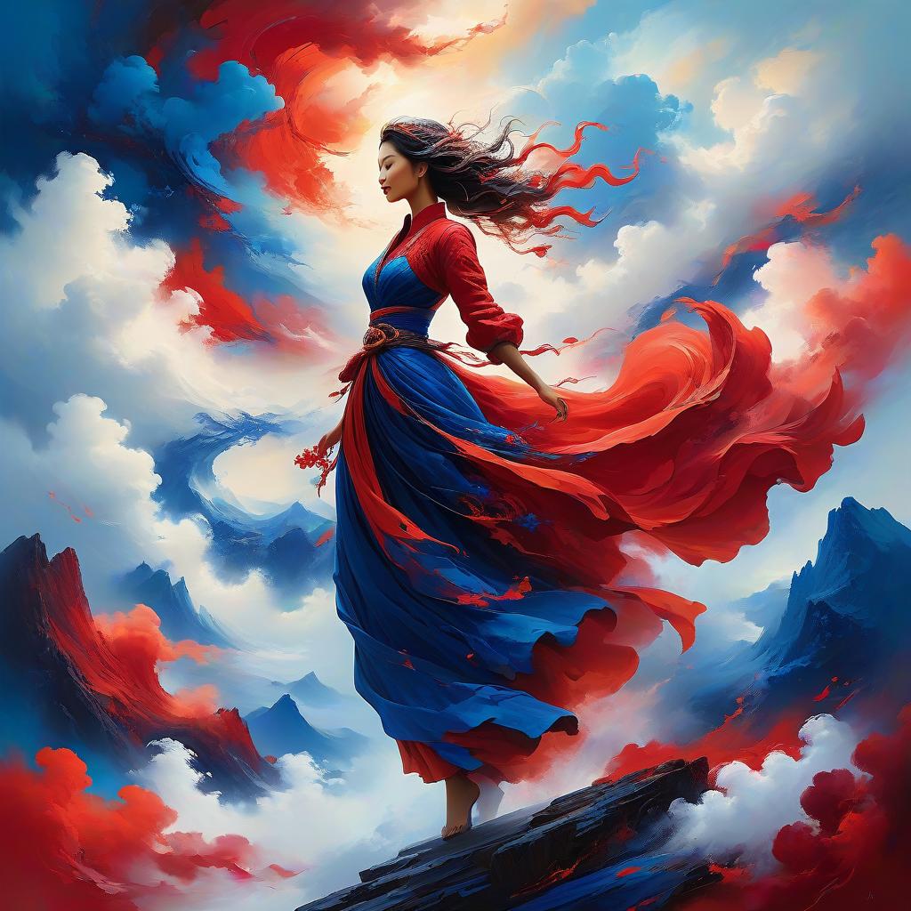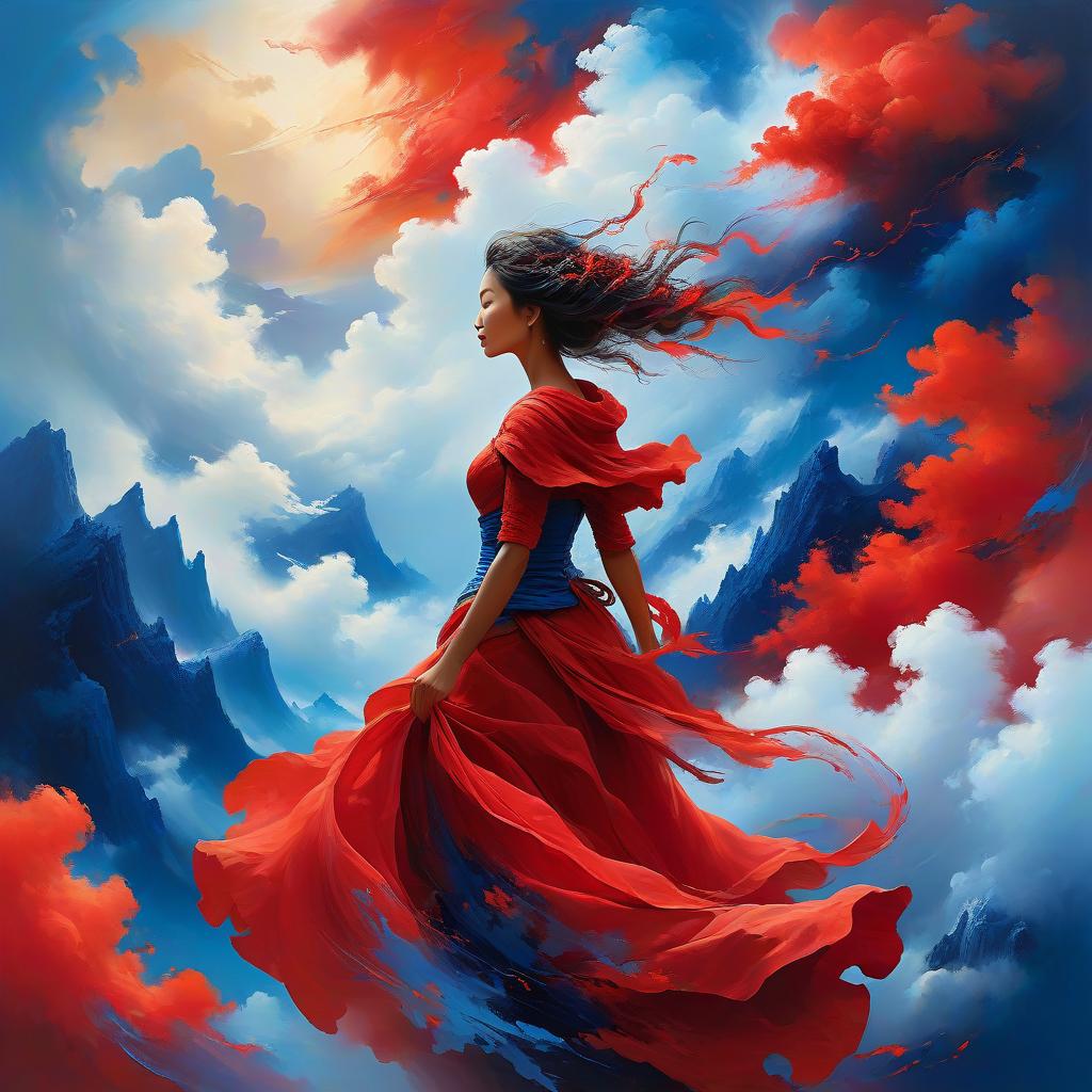 A radiant figure symbolizing the thrill of adventure, bursting with vibrant reds and deep blues. The artwork emphasizes swirling clouds and dynamic landscapes, blending abstraction and emotion in a dazzling and captivating design.