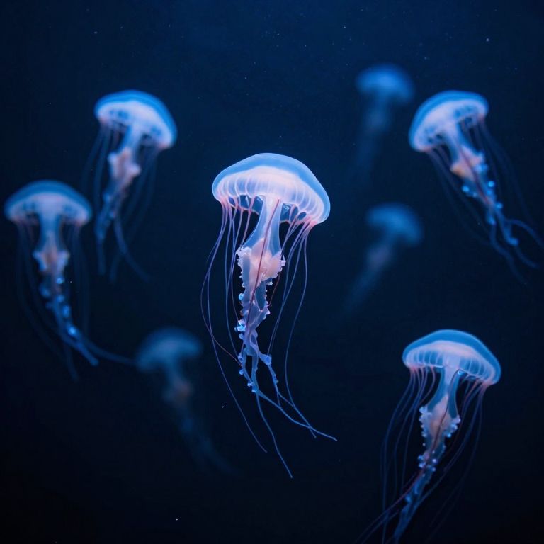 In a mesmerizing dance of light and shadow, a congregation of bioluminescent jellyfish drifts through the abyssal depths, their rhythmic pulses weaving a haunting symphony of serenity and mystery, evoking the timeless ebb and flow of existence.