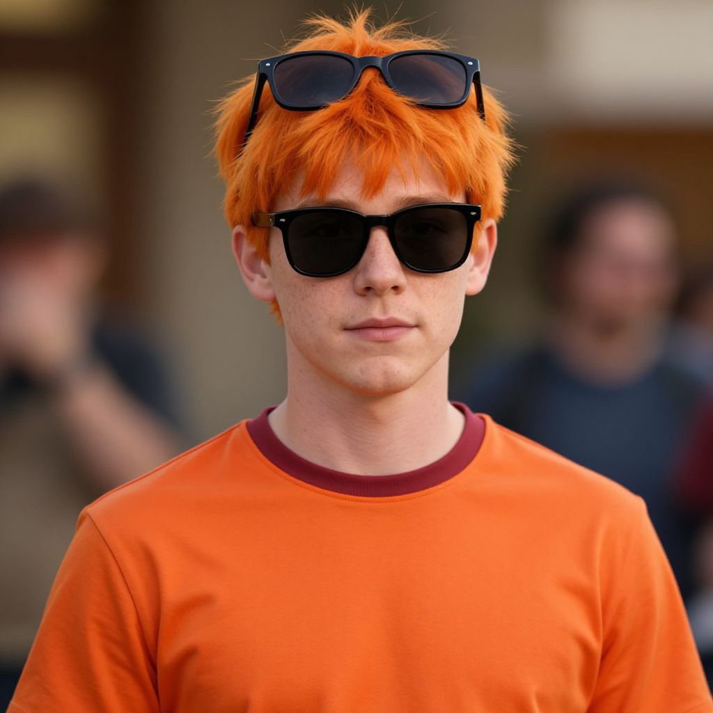 Photograph of a young man with bright orange spiky hair, wearing black sunglasses and an orange shirt, standing outdoors with a blurred background.