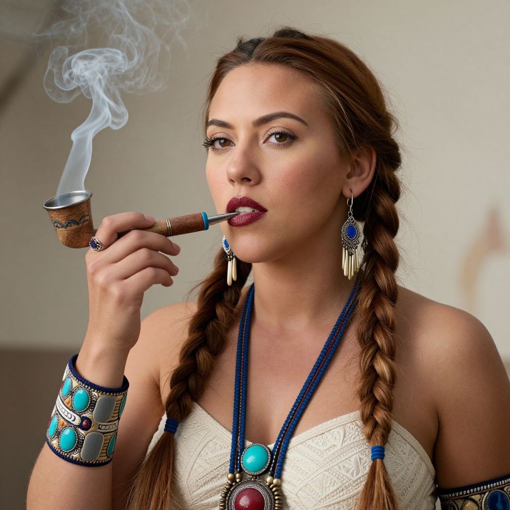 Photo of a beautiful native american indian woman, scarlett johansson smoking a pipe of peace, portrait, skilled warrior of the apache, ancient, realistic, detailed