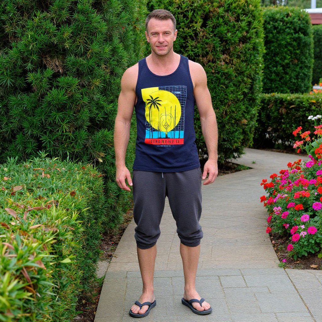 A man, graphic print muscle tank, bold colors, breathable cotton jogger shorts, charcoal gray, sporty flip-flops, relaxed summer look, lush green hedges, vibrant flower beds, winding stone pathways, technicolor analog film stock, cheerful expression. Man has masculine face and piercing eyes
