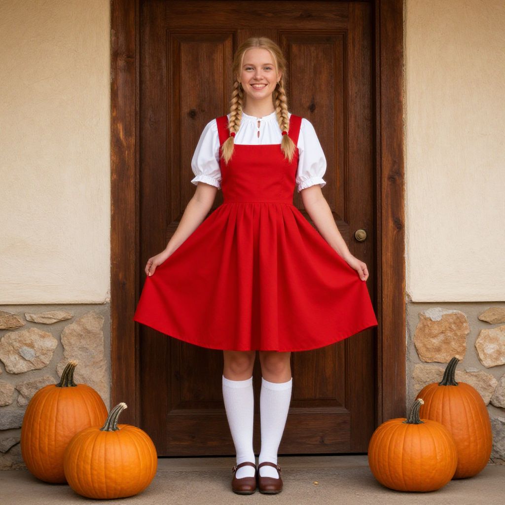 A young woman with blonde hair styled in braids is dressed in a traditional red costume featuring a gathered skirt and white puffed sleeves. She stands smiling in front of a rustic wooden door, wearing knee-high white socks and brown shoes, with pumpkins placed on the ground beside her, evoking an autumn or festive atmosphere.