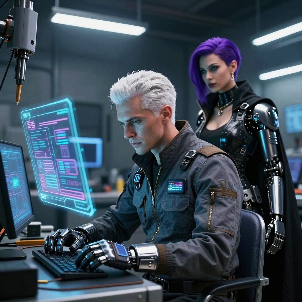 Cyberpunk Engineer and Informant in Repair Bay