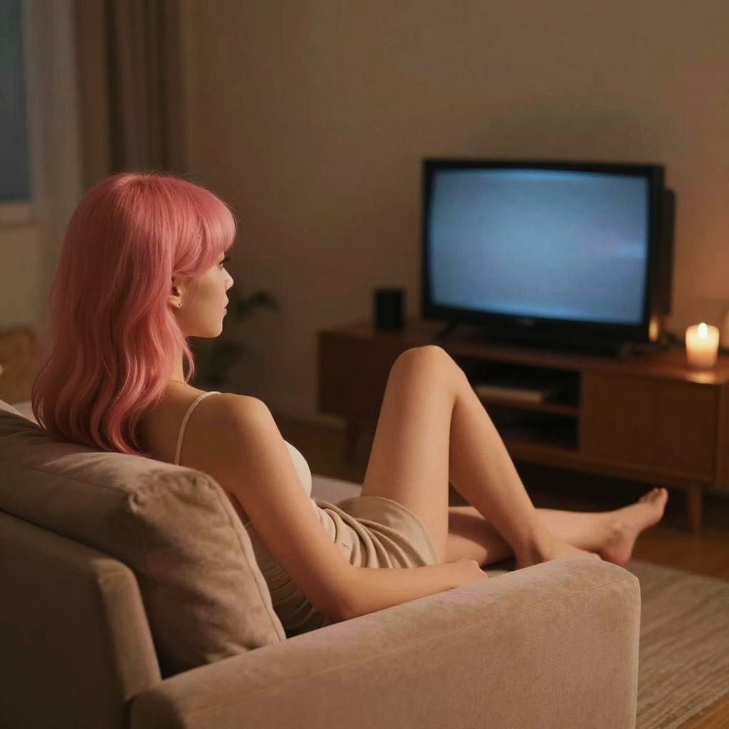 Nsfw, best quality, masterpiece, ultra high res, (photorealistic:1.3), 8K, raw photo, 1girl, full body, natural skin texture, netflix and chill, watching Netflix, (cozy atmosphere:1.3), chilling, looking at tv, watching tv, (pink hair:1.4), retro, lying on the sofa, dim lights, bedroom, Relaxed, calm, focused, minimalist, nostalgic, comforting, aesthetic, serene, productive, tranquil, introspective, rhythmic, repetitive, meditative, ambient, consistent, simplistic, atmospheric, cozy, intimate, television in the background, candlelight, (dark atmosphere:1.3), at night