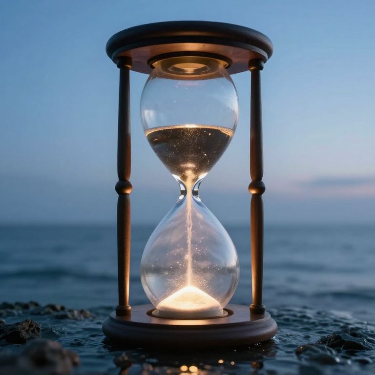 Photograph of a transparent hourglass with a glowing amber light inside, illuminating the flowing sand. The hourglass is framed by two black metal rods and stands on a circular wooden base. The background is a serene, twilight blue sky meeting a calm ocean, with a rocky shoreline visible at the bottom. The hourglass's light creates a warm glow, contrasting with the cool blue tones of the sky and sea. The sand is mid-flow, capturing a moment of time in motion.