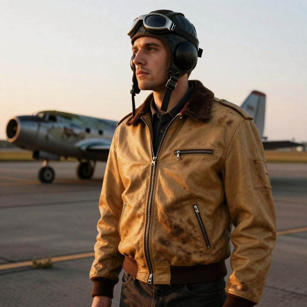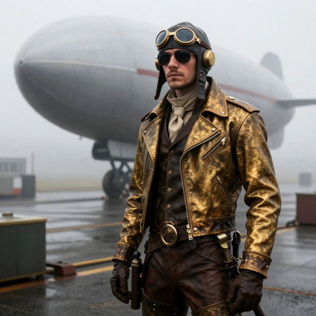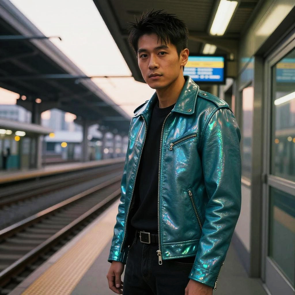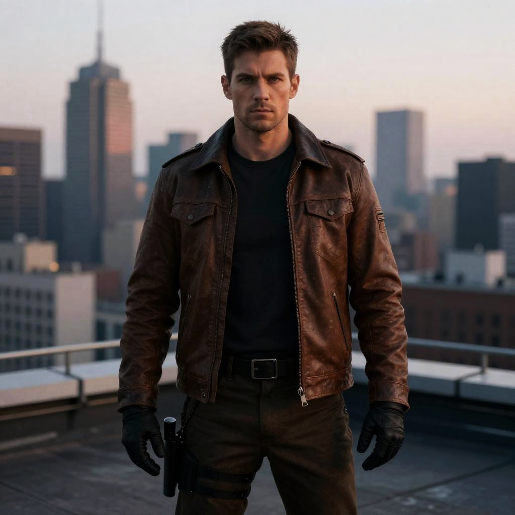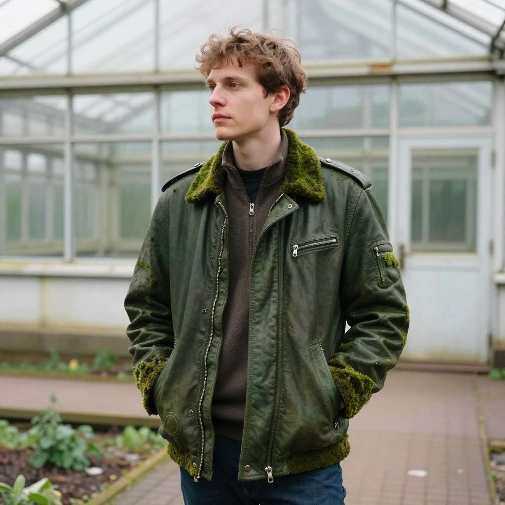 Curious scientist in a white leather jacket, standing near a bustling laboratory