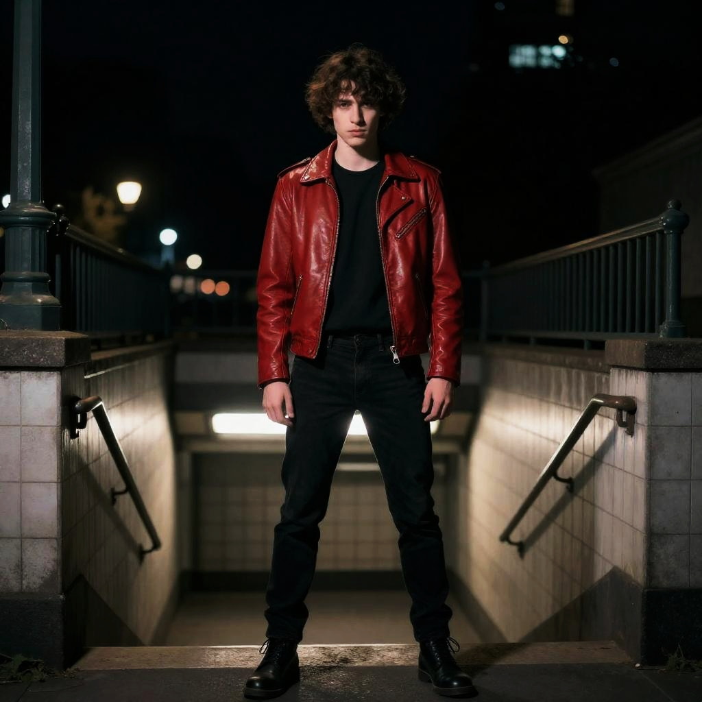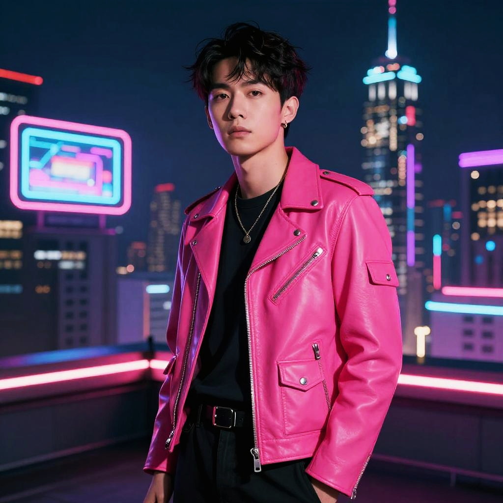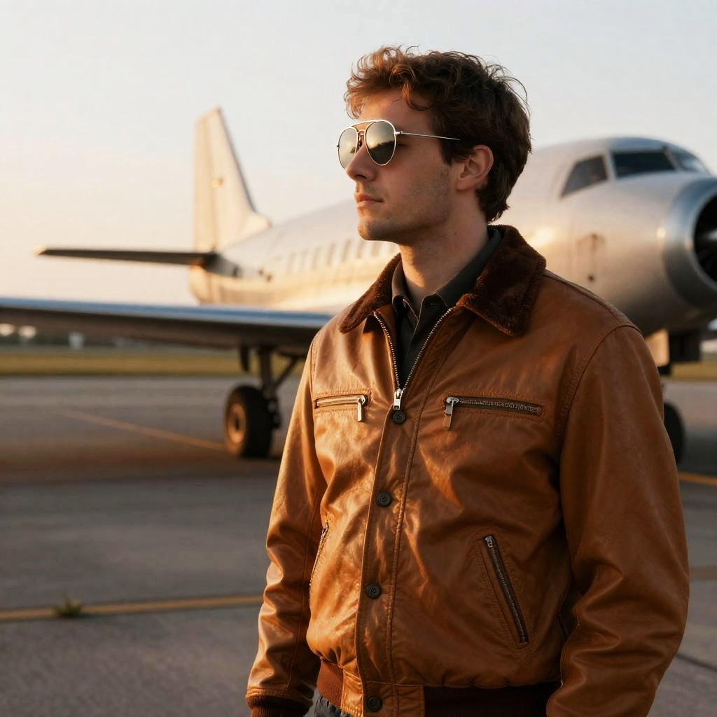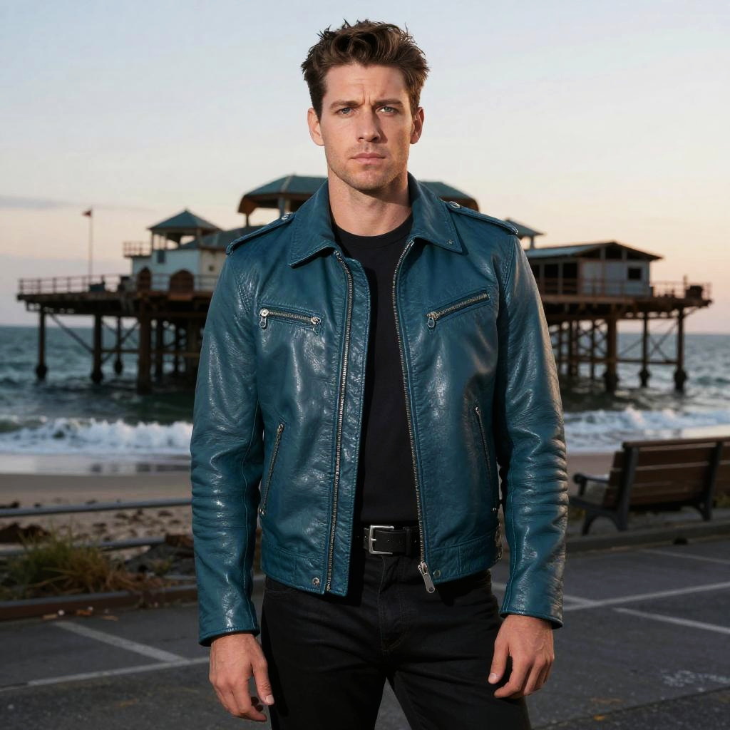 Curious scientist in a white leather jacket, standing near a bustling laboratory
