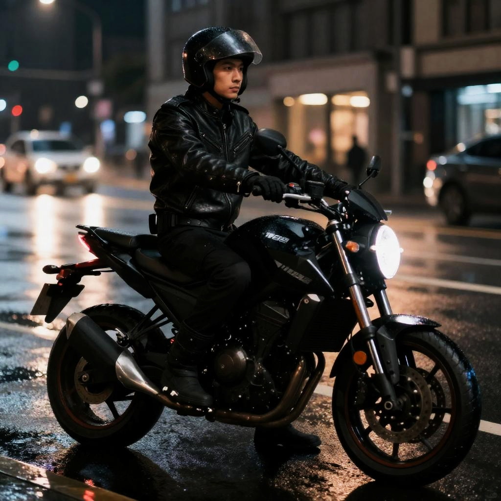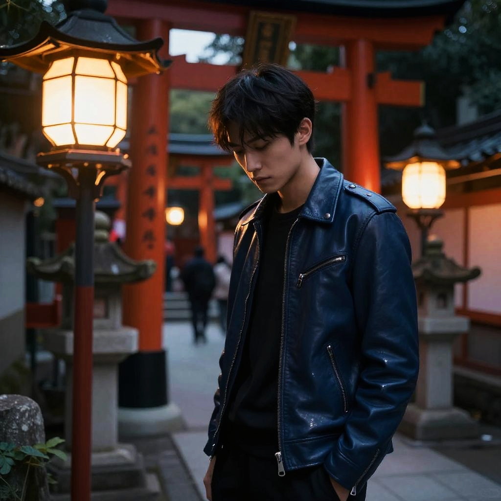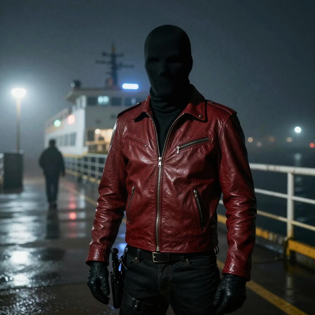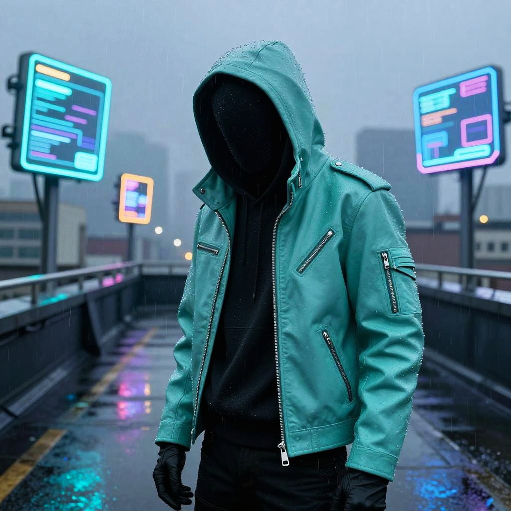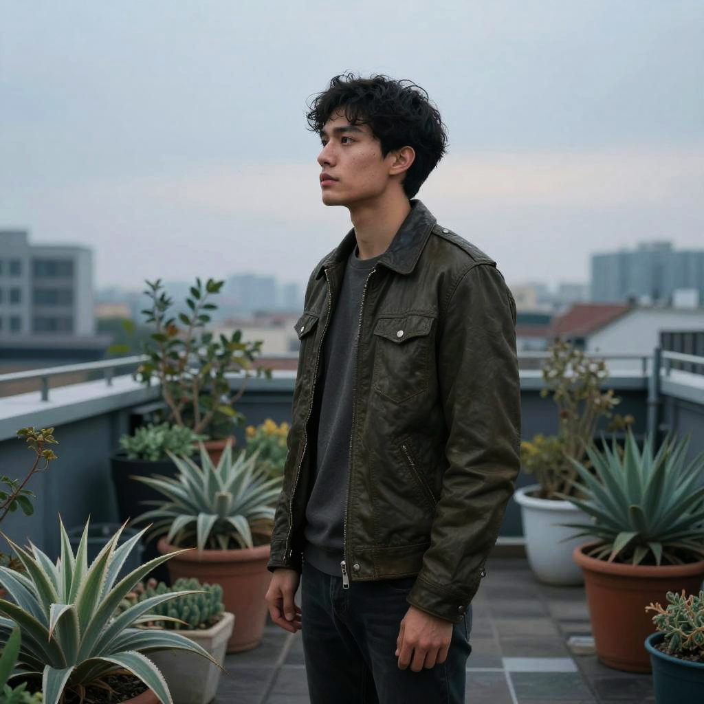Curious scientist in a white leather jacket, standing near a bustling laboratory