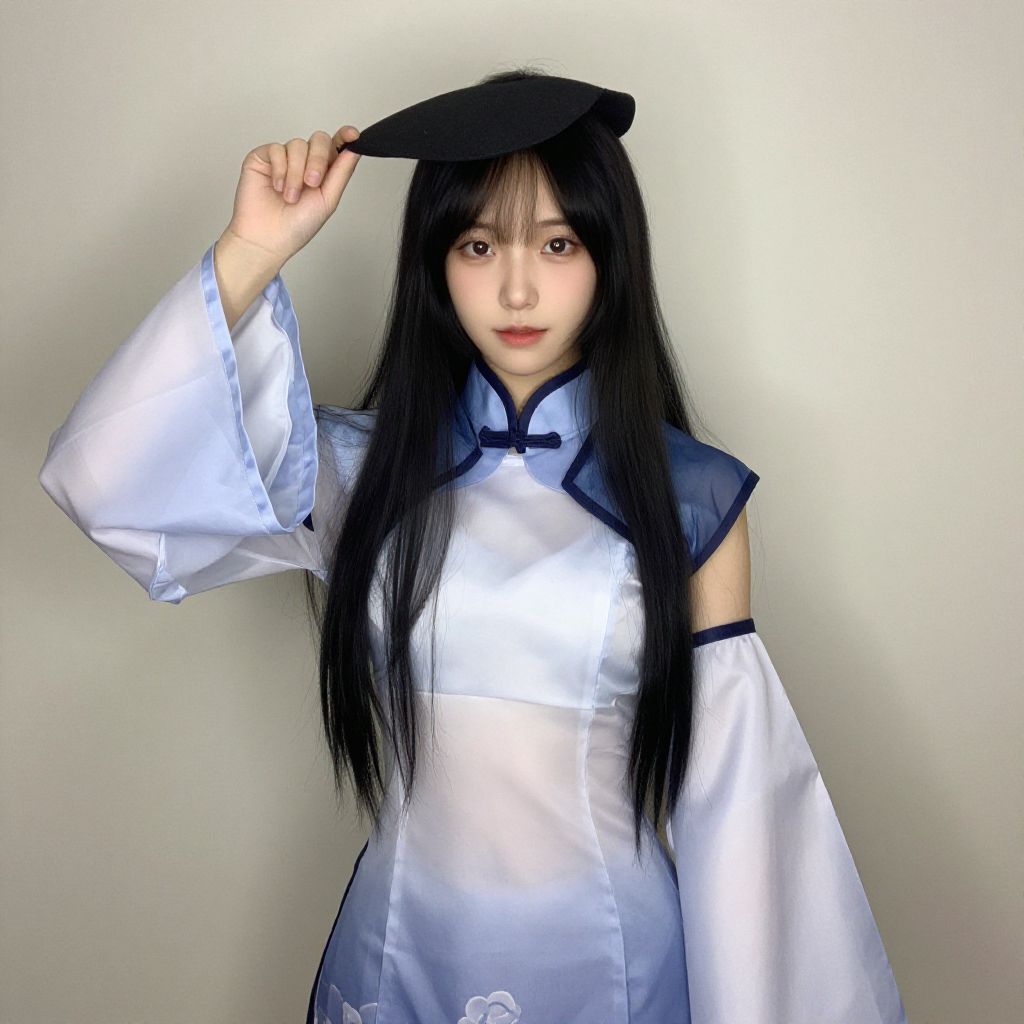 Photograph of an East Asian woman with long, straight black hair and fair skin, wearing a silver and blue Chinese-inspired dress with wide, flowing sleeves and a high collar. She holds a black graduation-style cap in her right hand, tilted slightly on her head. Her expression is neutral, with a subtle smile. The background is a plain, light gray wall, creating a soft contrast with her outfit. The lighting is even, highlighting the shiny texture of her dress. The overall style is modern and slightly cosplay-inspired.